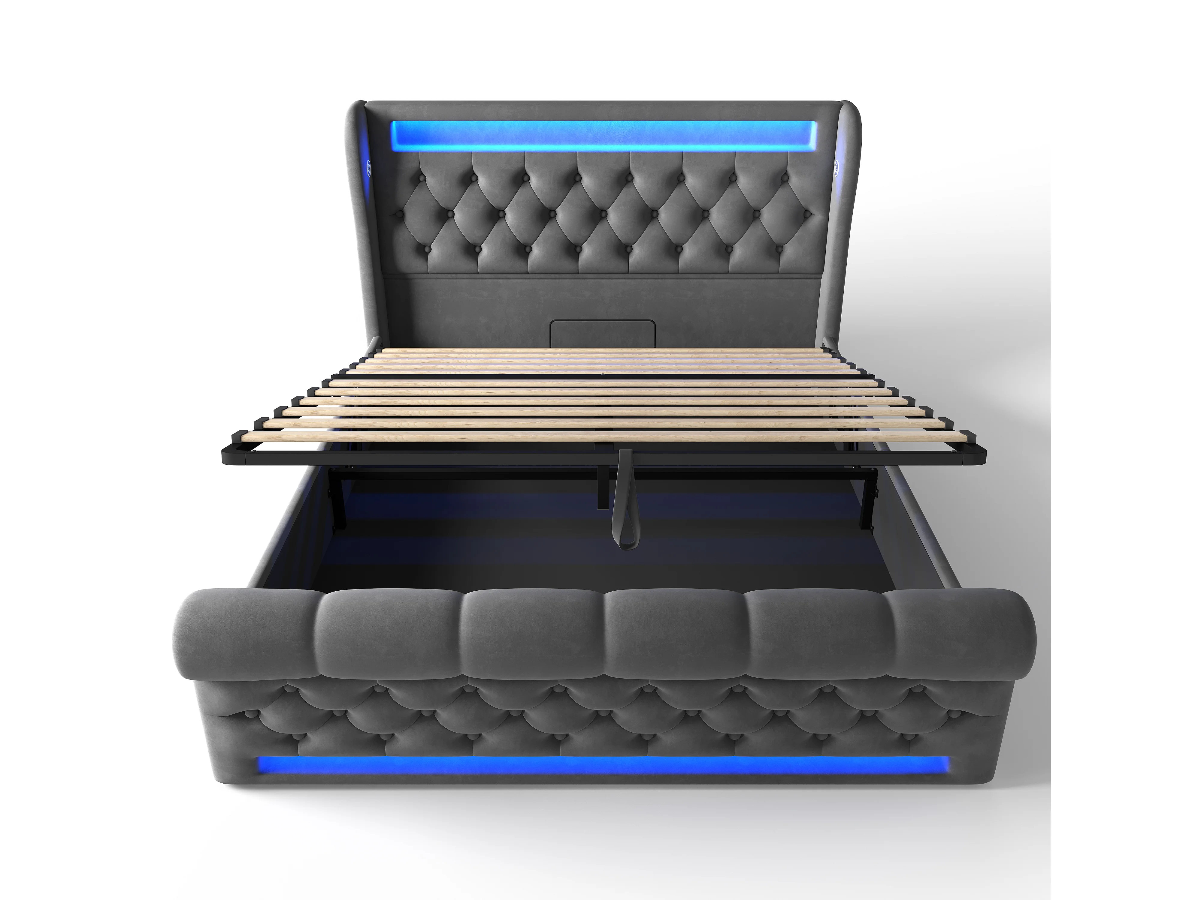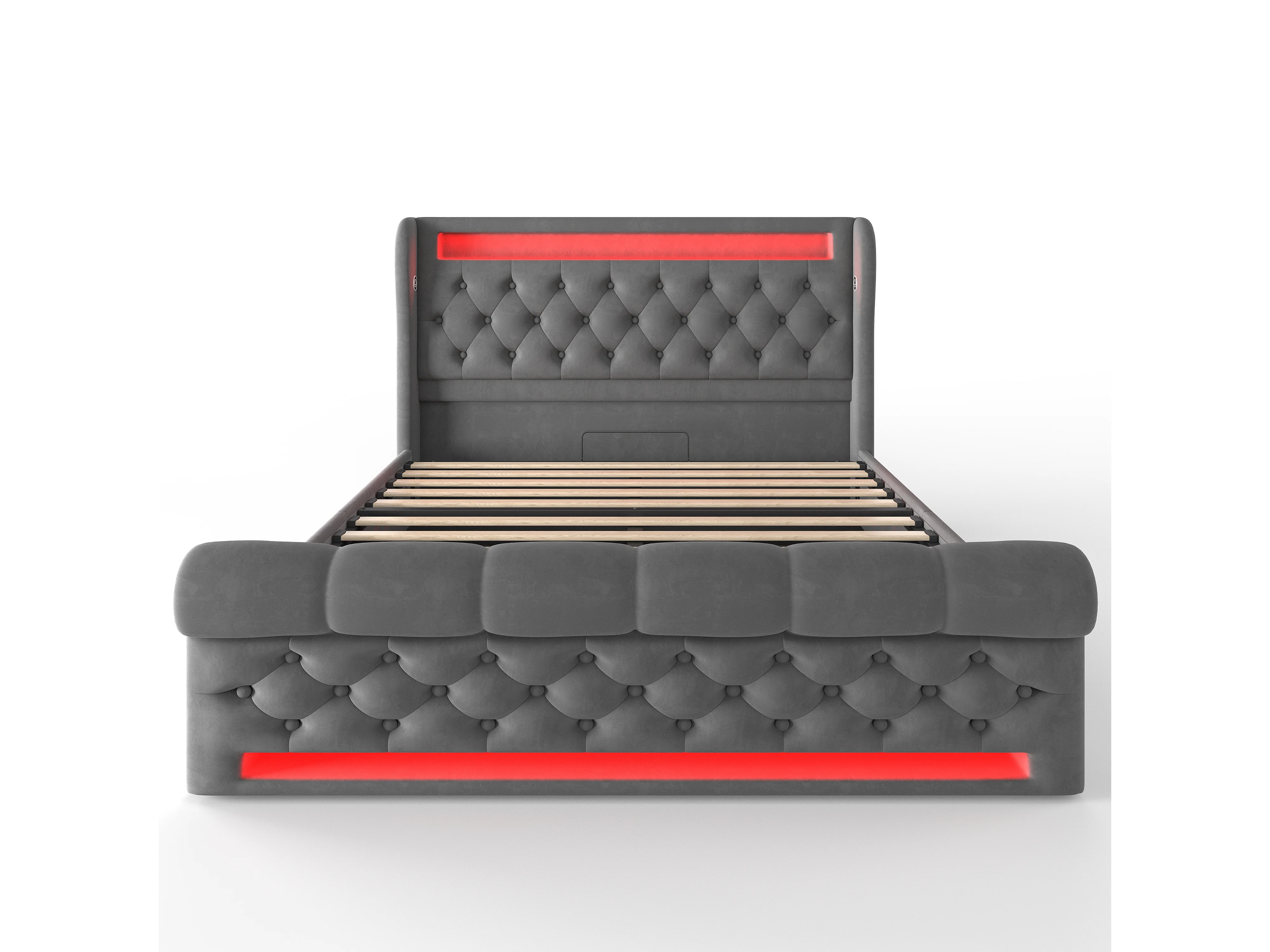 Gestoffeerd Bed 160x200 cm - RGB LED met Muziek - Hydraulisch Opbergbed met USB+Type-C - Fluweel - Grijs - zonder matras