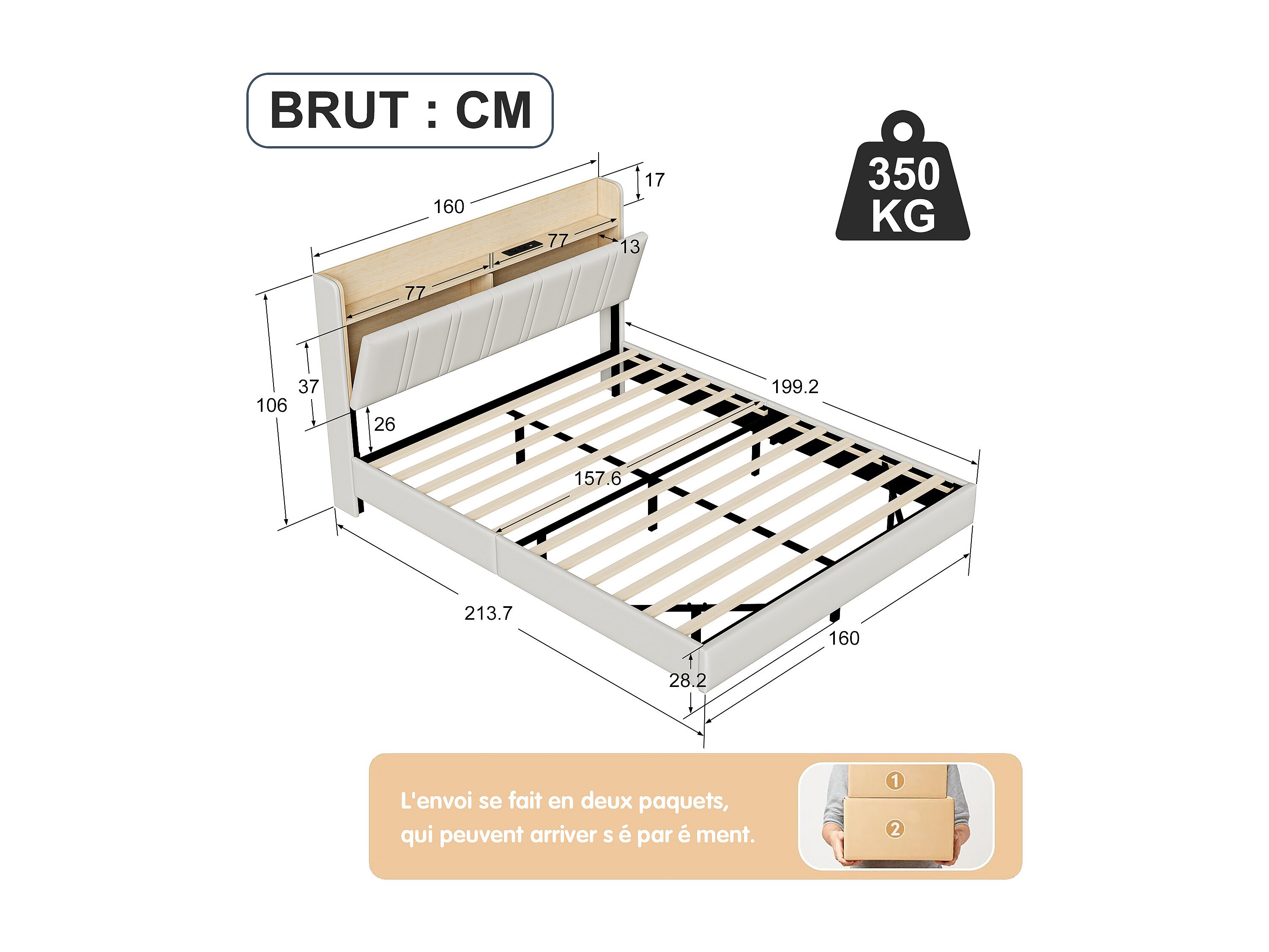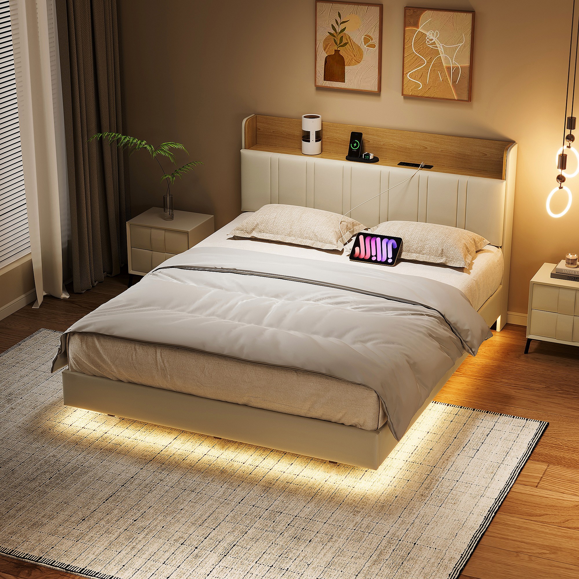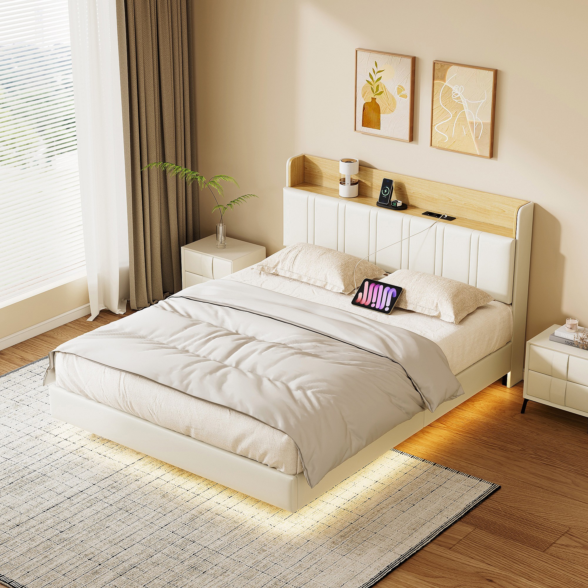 Gestoffeerd bed 160x200 cm wit PU & licht hout met LED-onderbed, opbergvak hoofdbord, dubbele USB-aansluitingen, zijvakken, matras niet inbegrepen