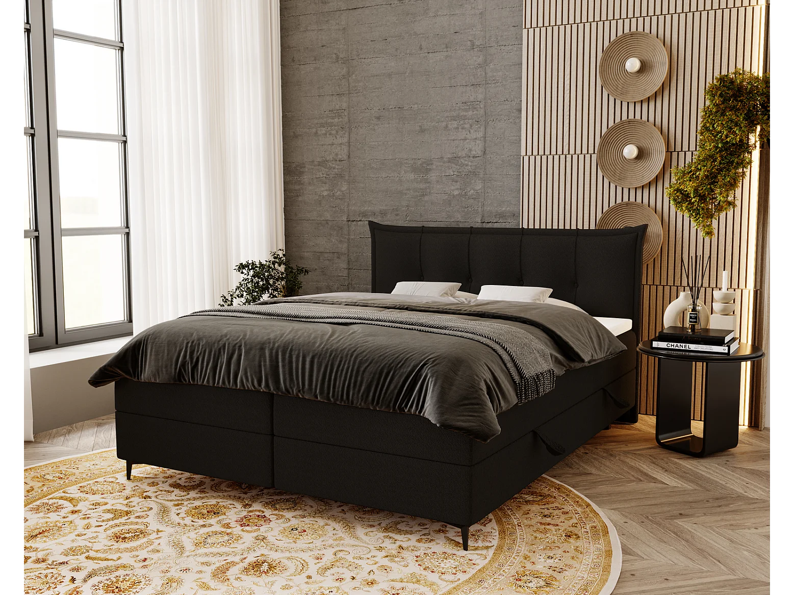 Gestoffeerd bed 160x200 Liron - Tweepersoonsbed met matras, met topper, opbergruimte, Zwart (Anthology 19)