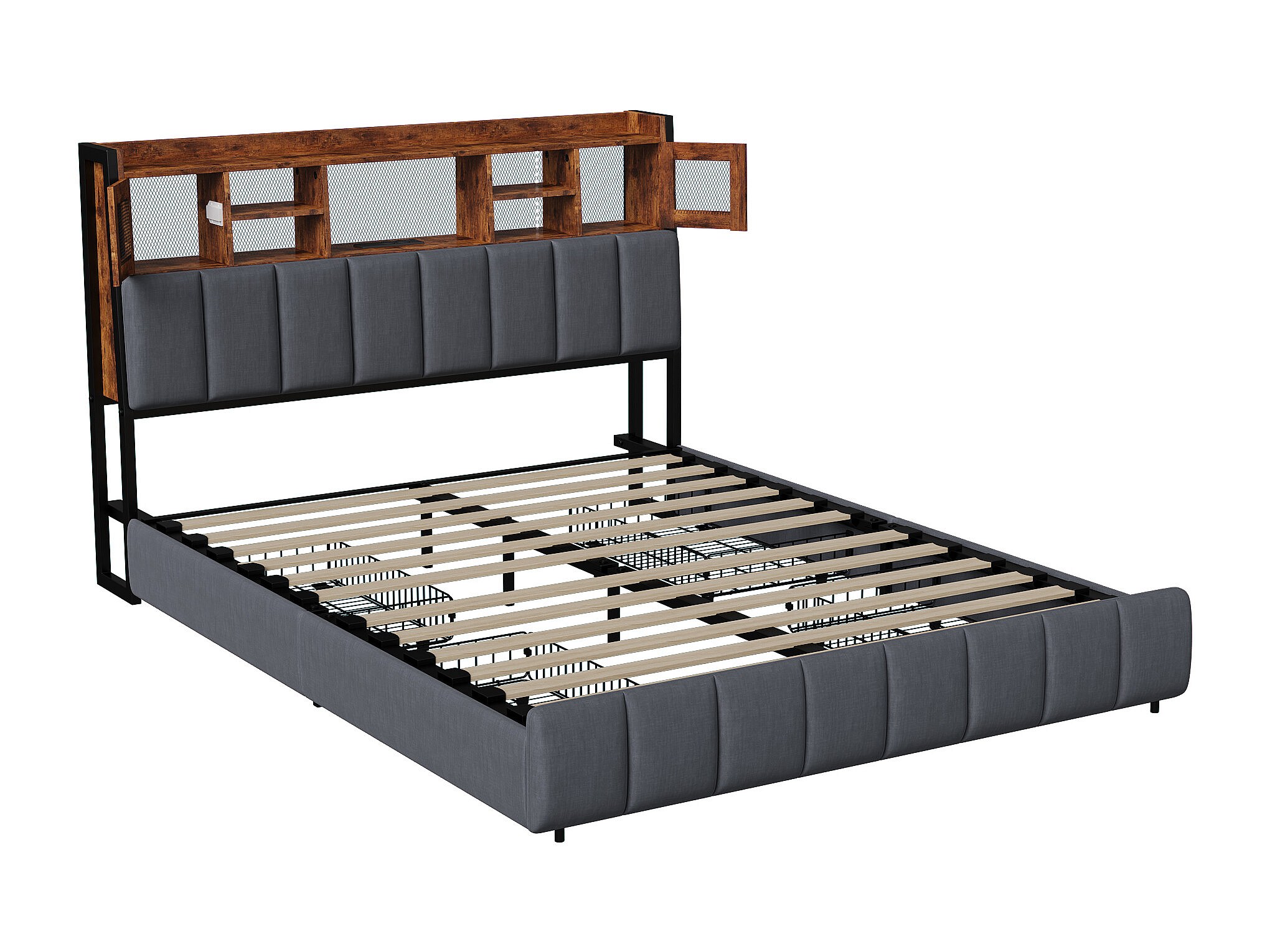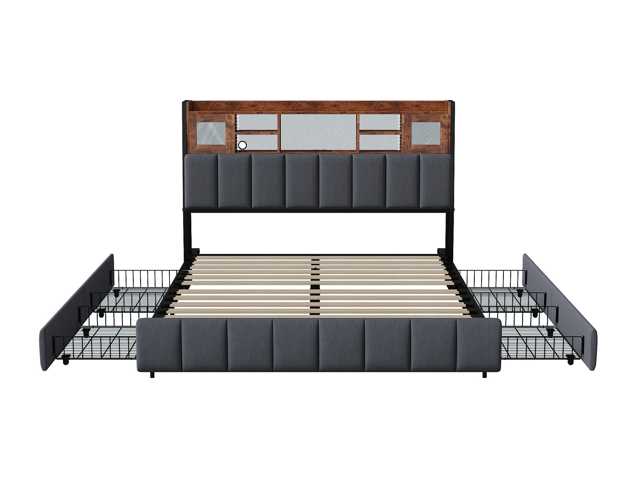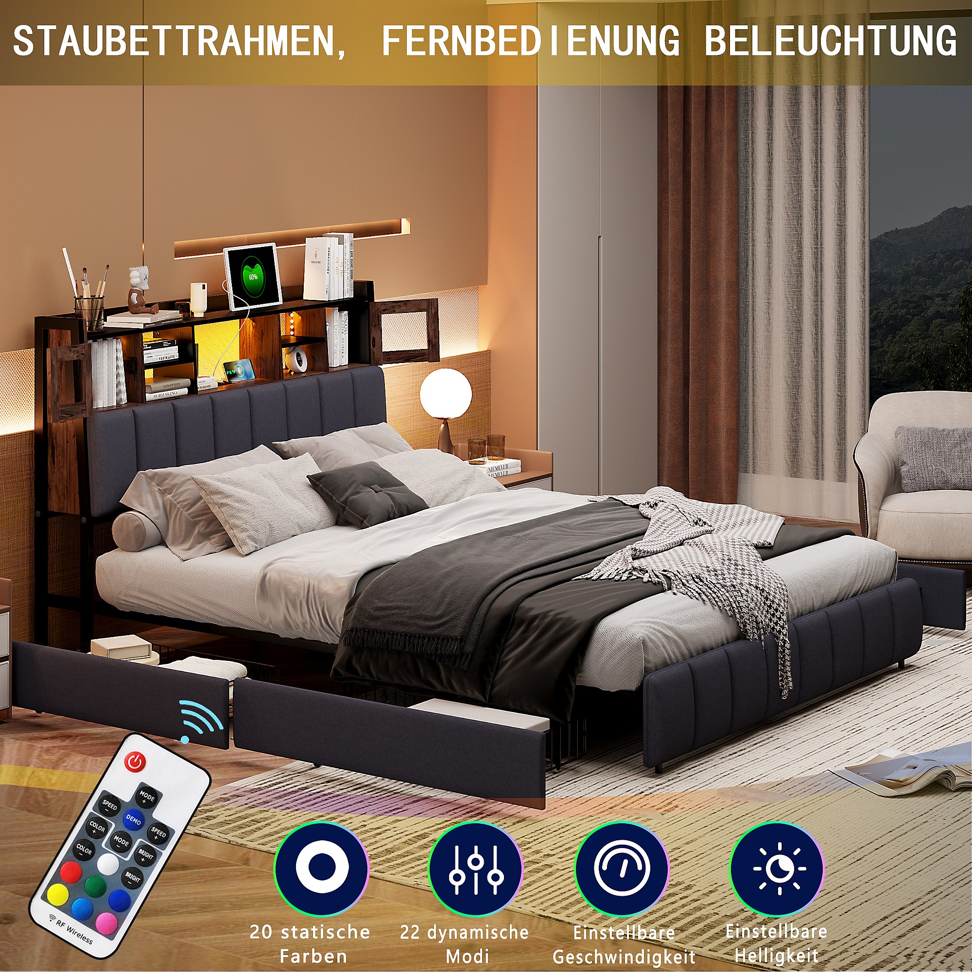 Gestoffeerd bed 160x200cm met USB en stopcontacten, tweepersoonsbed met 4 lades, opbergbed met LED, linnen, zwart