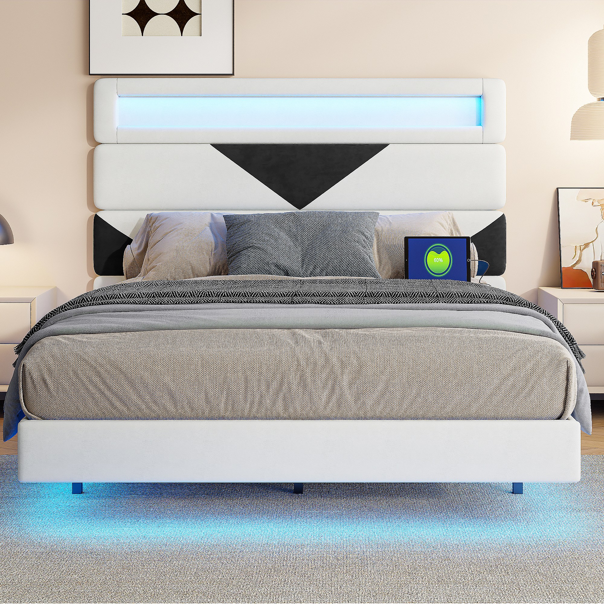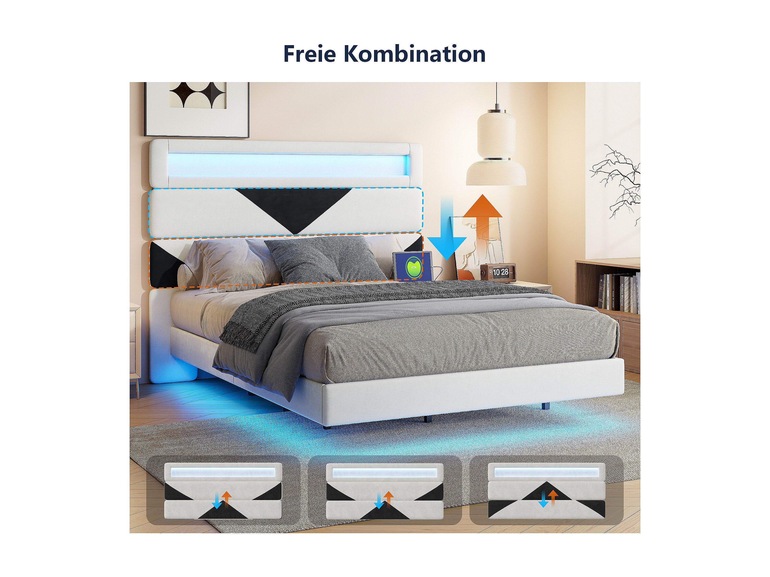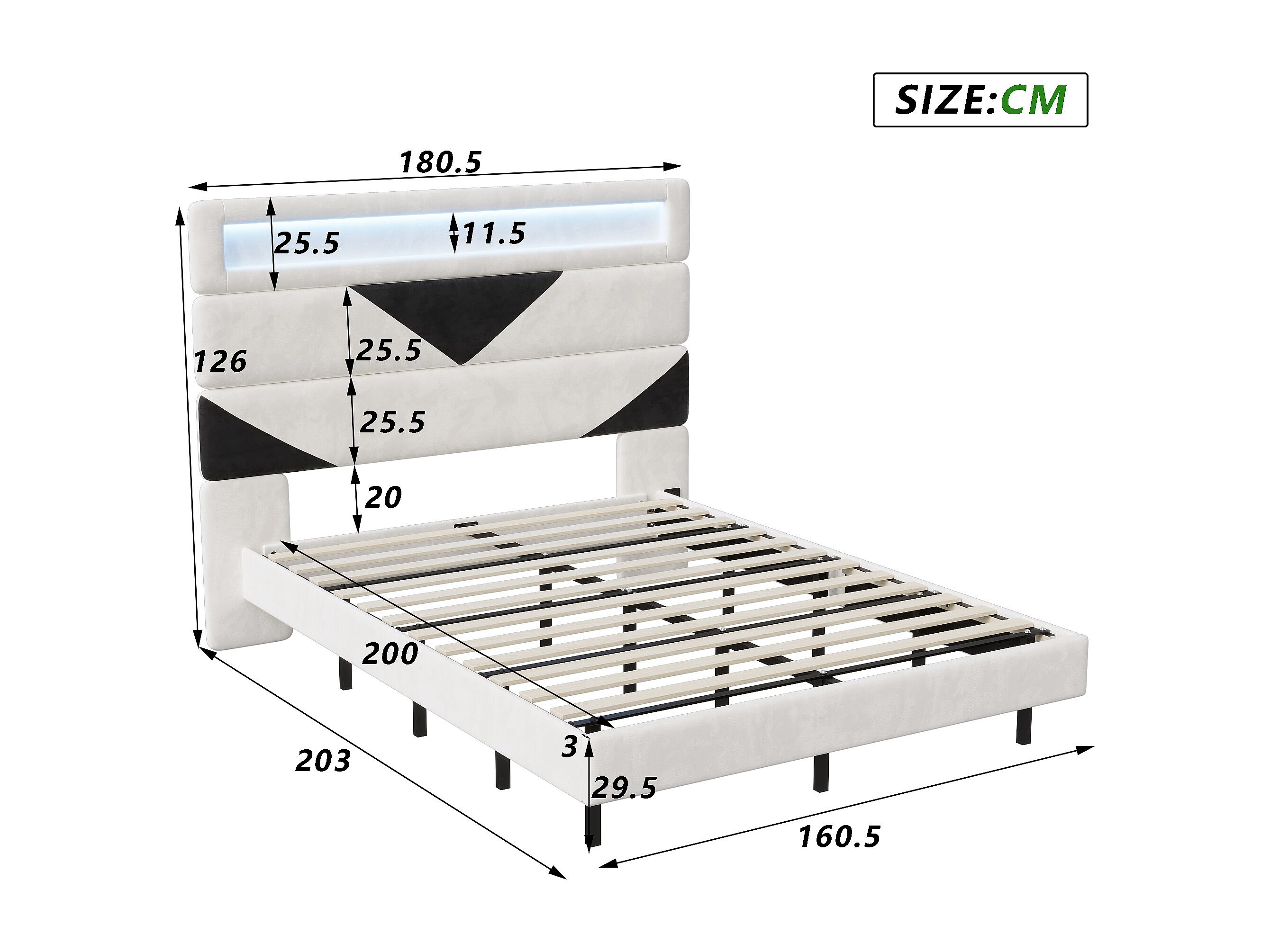 Gestoffeerd bed 160x200cm met USB & LED, opbergbed met driehoekig hoofdeinde, fluweel, wit & zwart
