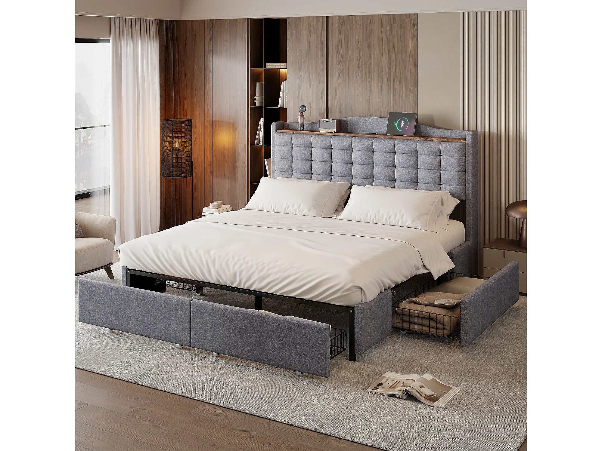 Gestoffeerd bed, 160x200cm, nachtkastje met USB-oplaadpoort en opbergruimte,tweepersoonsbed met 4 lades,grijs,matras niet inbegrepen