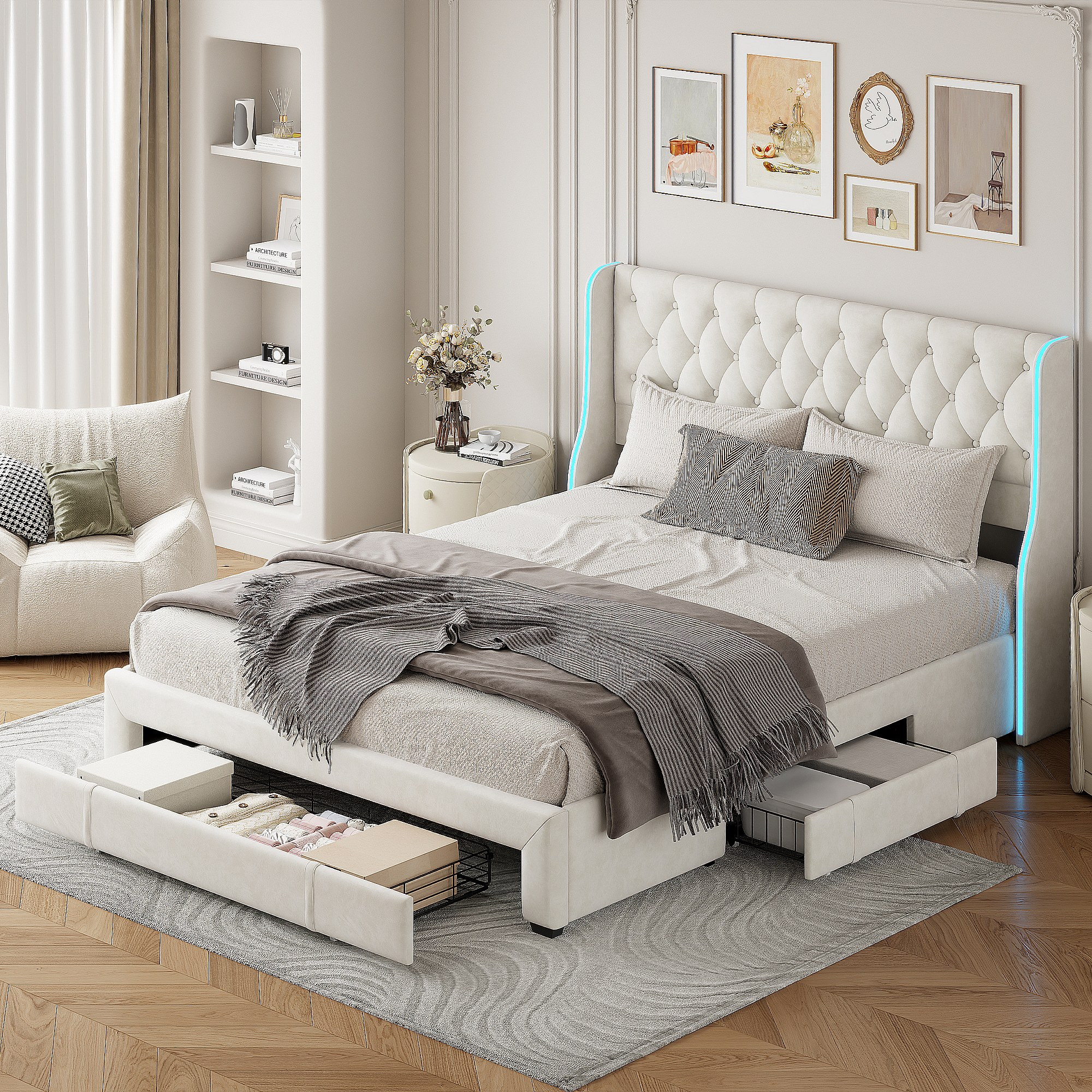 Gestoffeerd bed 160x200cm, tweepersoonsbed met 3 lades, LED, bedframe, fluweel, beige