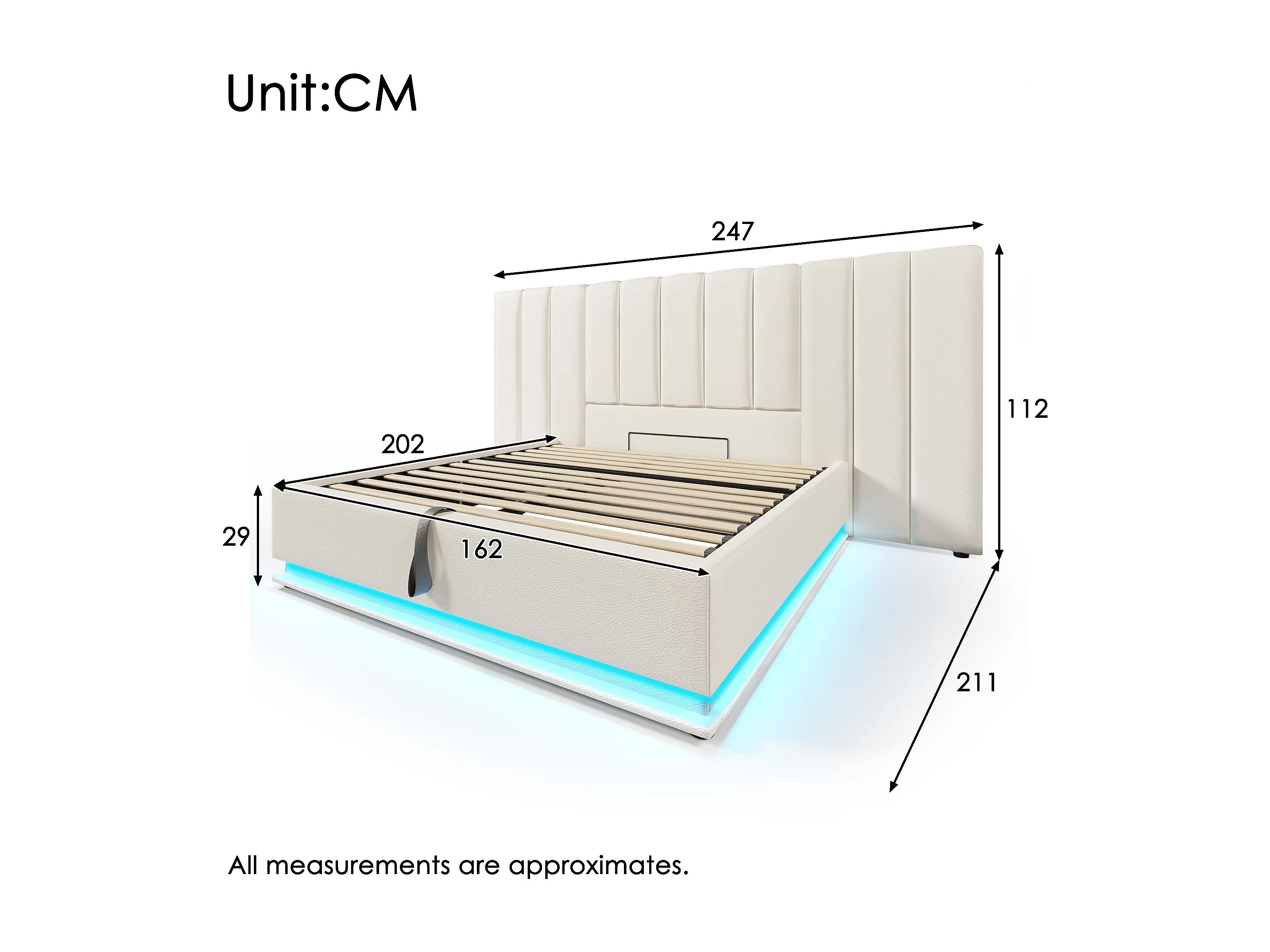 Gestoffeerd bed 160x200cm, tweepersoonsbed, met ledverlichting, USB-C, lattenbodem, PU, wit, inclusief matras, exclusief nachtkastje