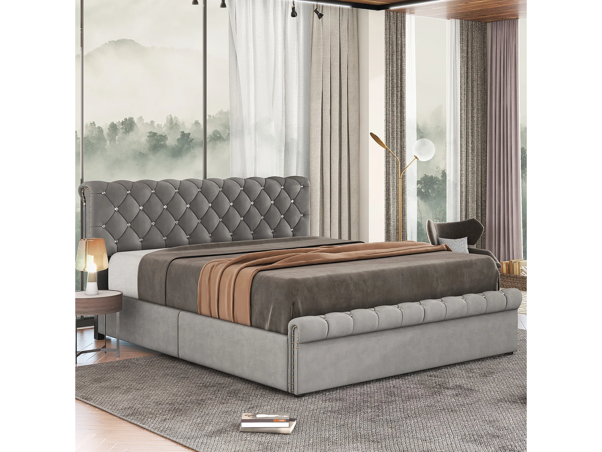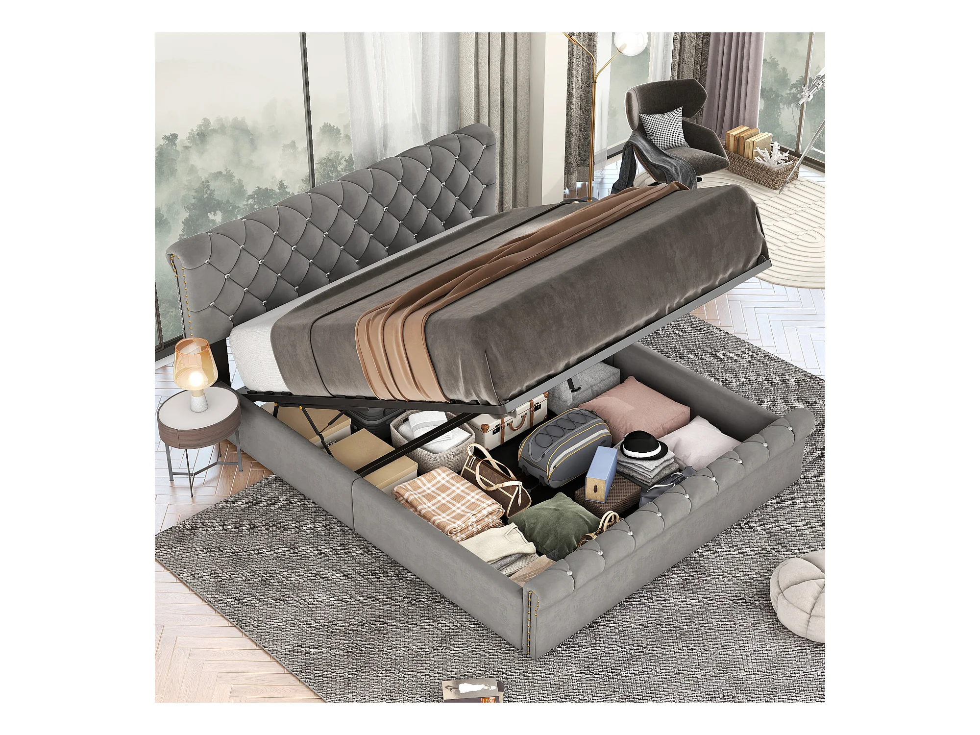 Gestoffeerd bed 180x200 cm met lattenbodem, hydraulische functie, opbergruimte, decoratief kristal, in hoogte verstelbaar hoofdeinde, grijs
