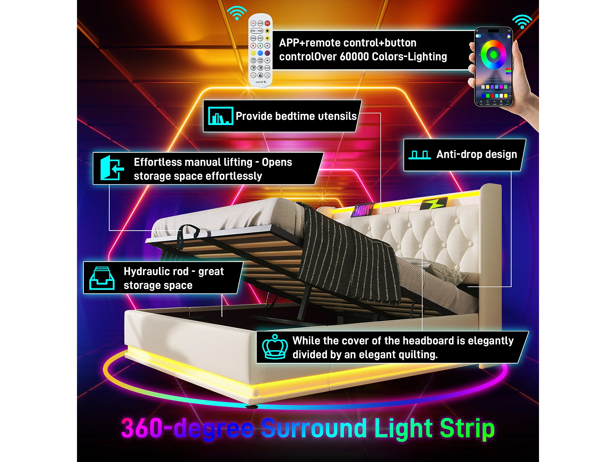 Gestoffeerd bed 180x200 cm – Tweepersoonsbed met 360° LED en app-bediening – Hydraulisch opbergbed met USB-C – PU bekleding – Wit – Zonder matras