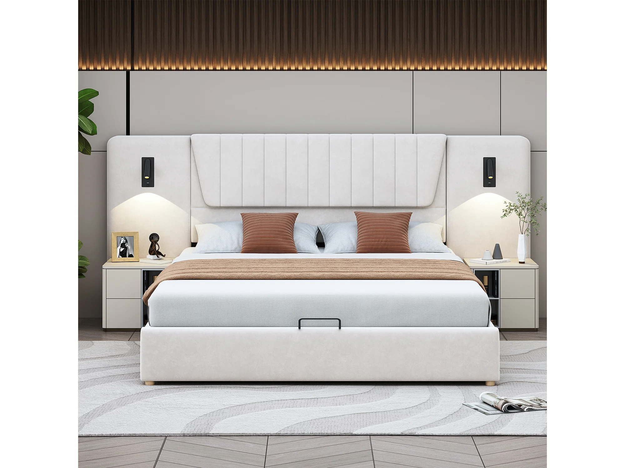 Gestoffeerd bed 180x200cm, extra lange rugleuning, verstelbare leeslamp, USB-aansluiting, hydraulisch opbergbed, beige fluweel (206x246,5x109cm)