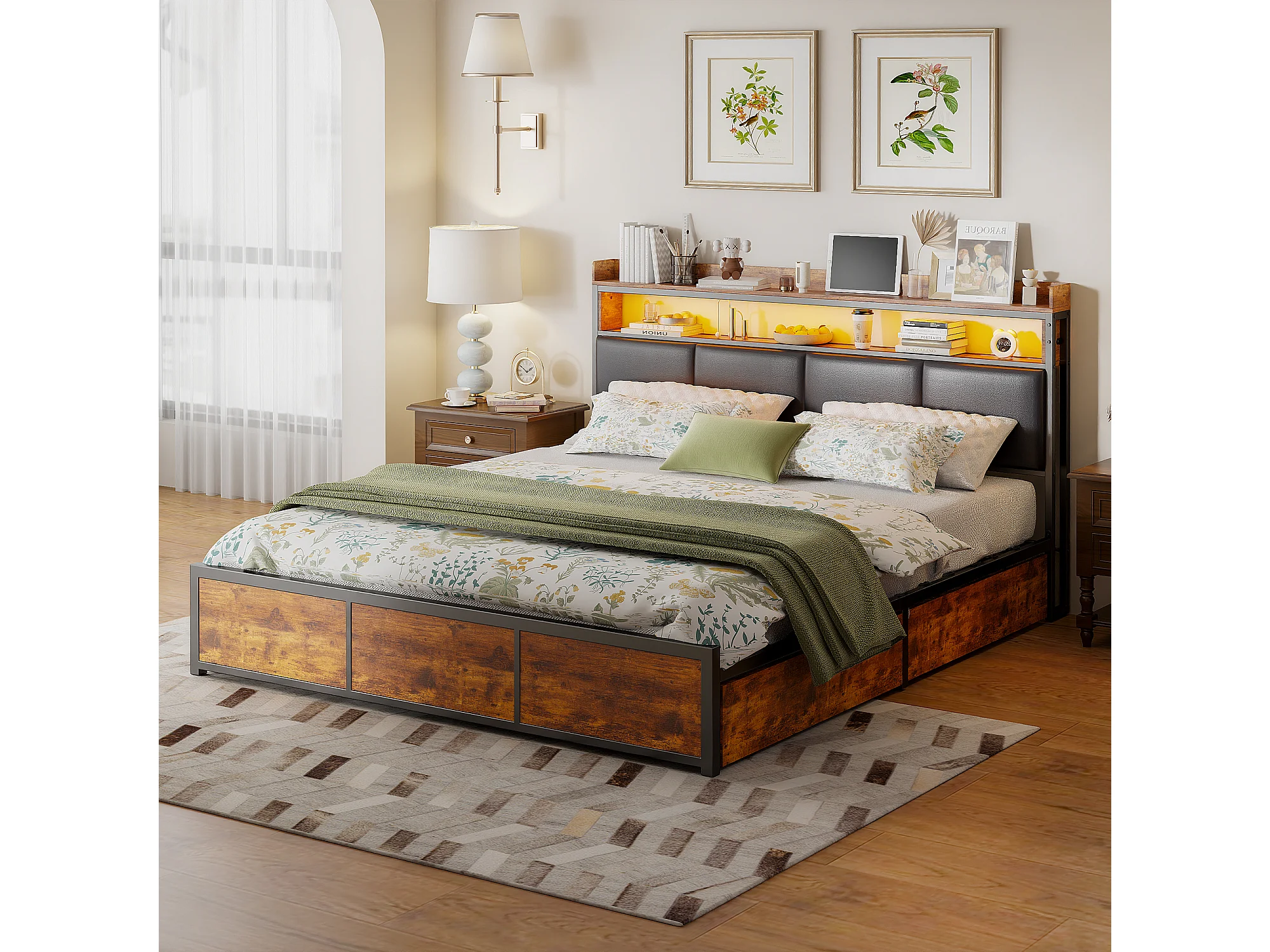 Gestoffeerd bed van 180x200 cm, metalen bed met LED-verlichting, met 4 lades, massief houten opbergbed, houtkleur