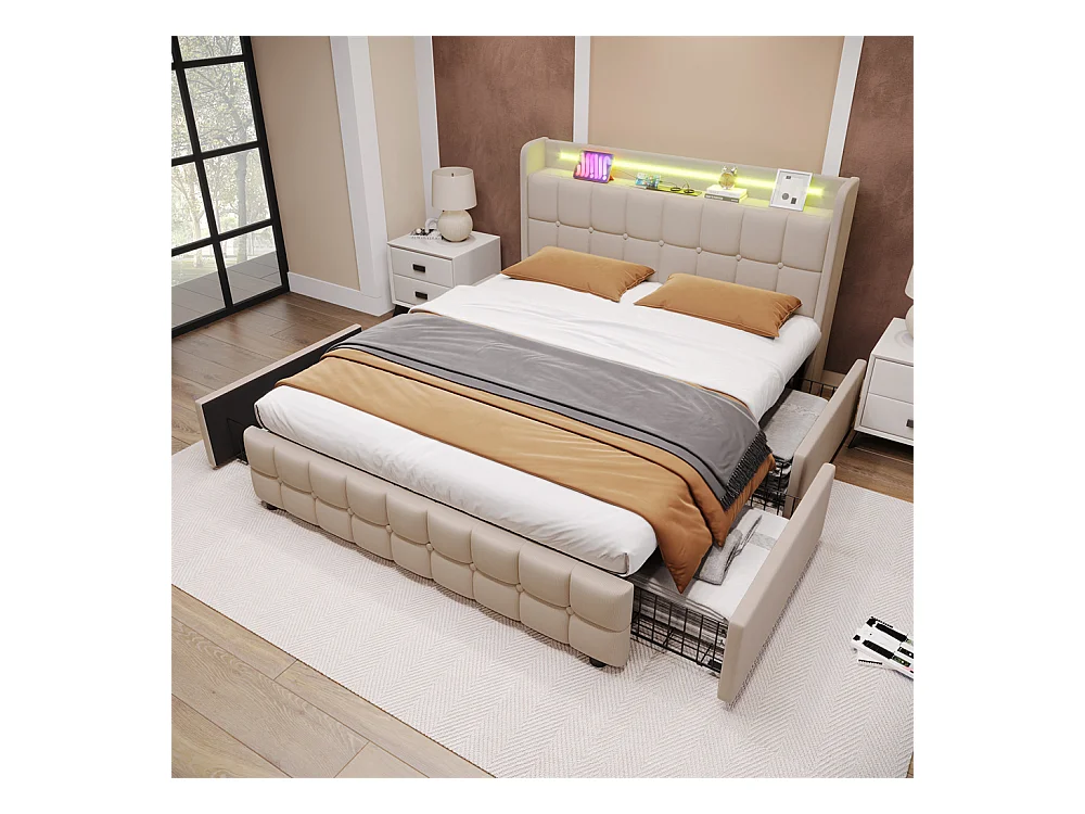 Gestoffeerd bed 180x200cm opbergbed bed 4 lades led verlichting bed houten lattenbodem tweepersoonsbed beige linnen
