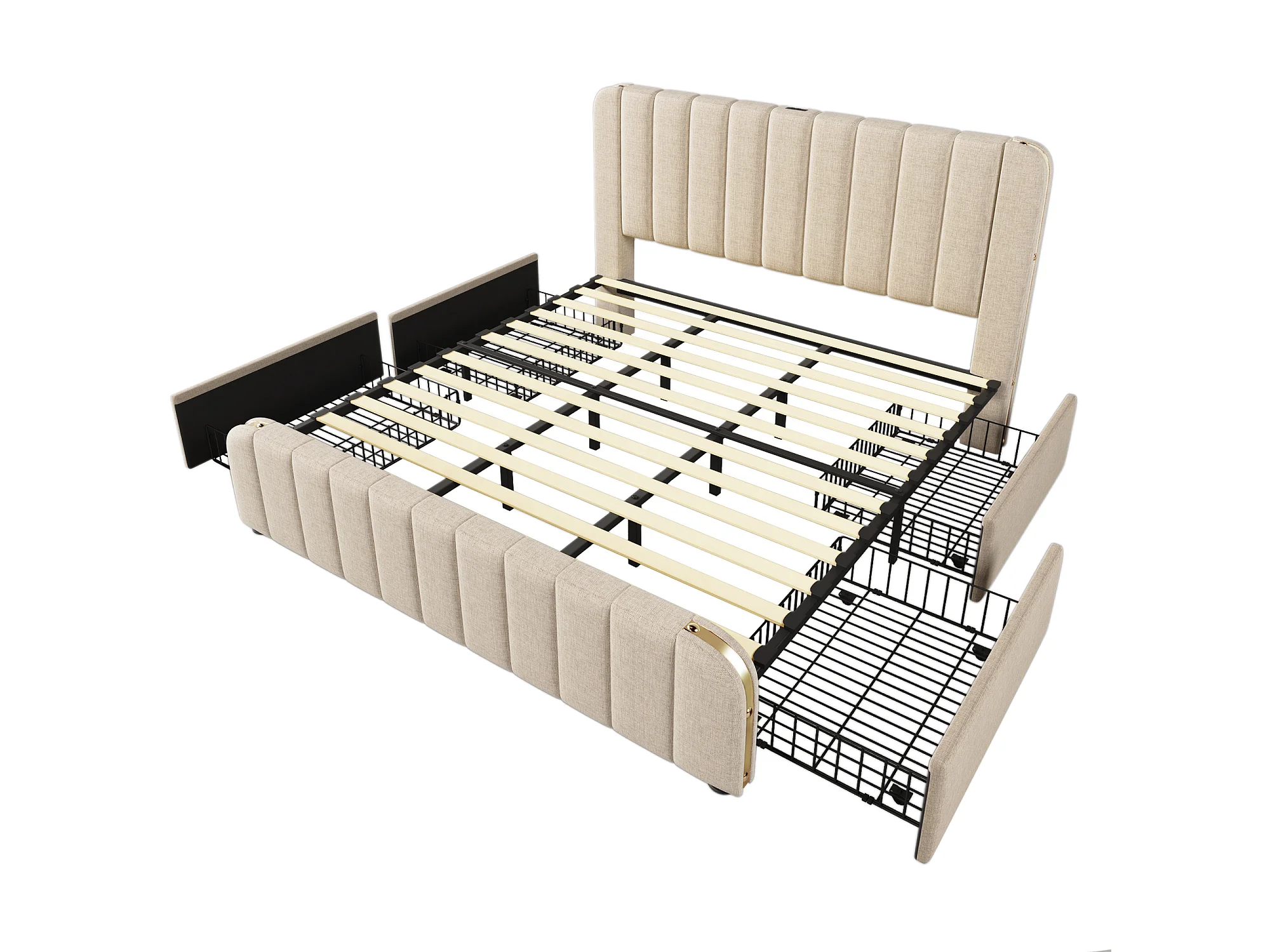 Gestoffeerd bed 180x200cm, tweepersoonsformaat, hoofdbord versierd met USB Type-C, 4 lades, beige, matras niet inbegrepen