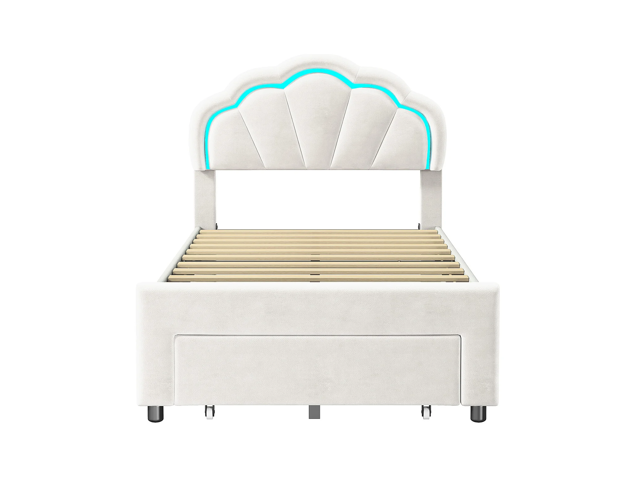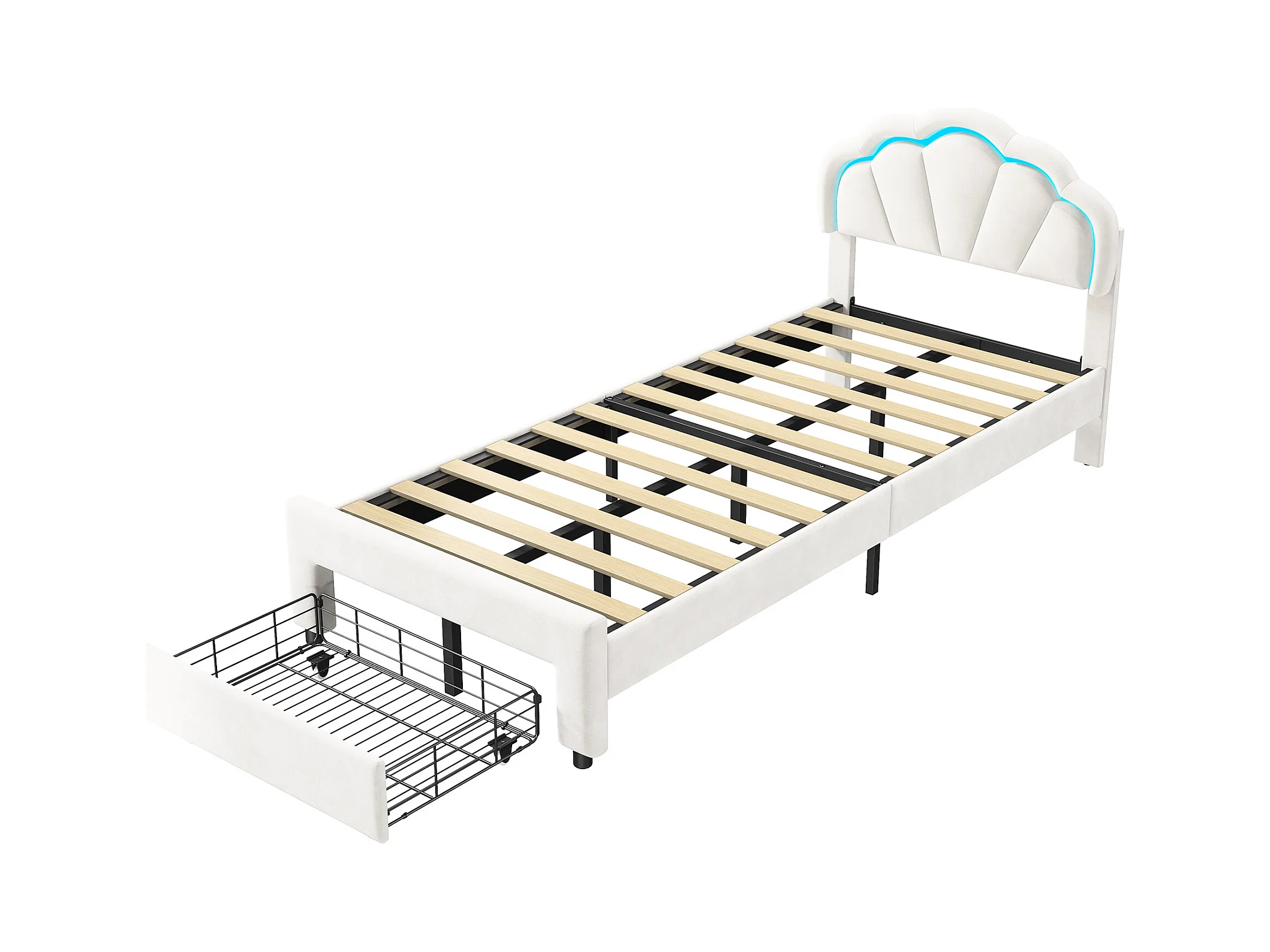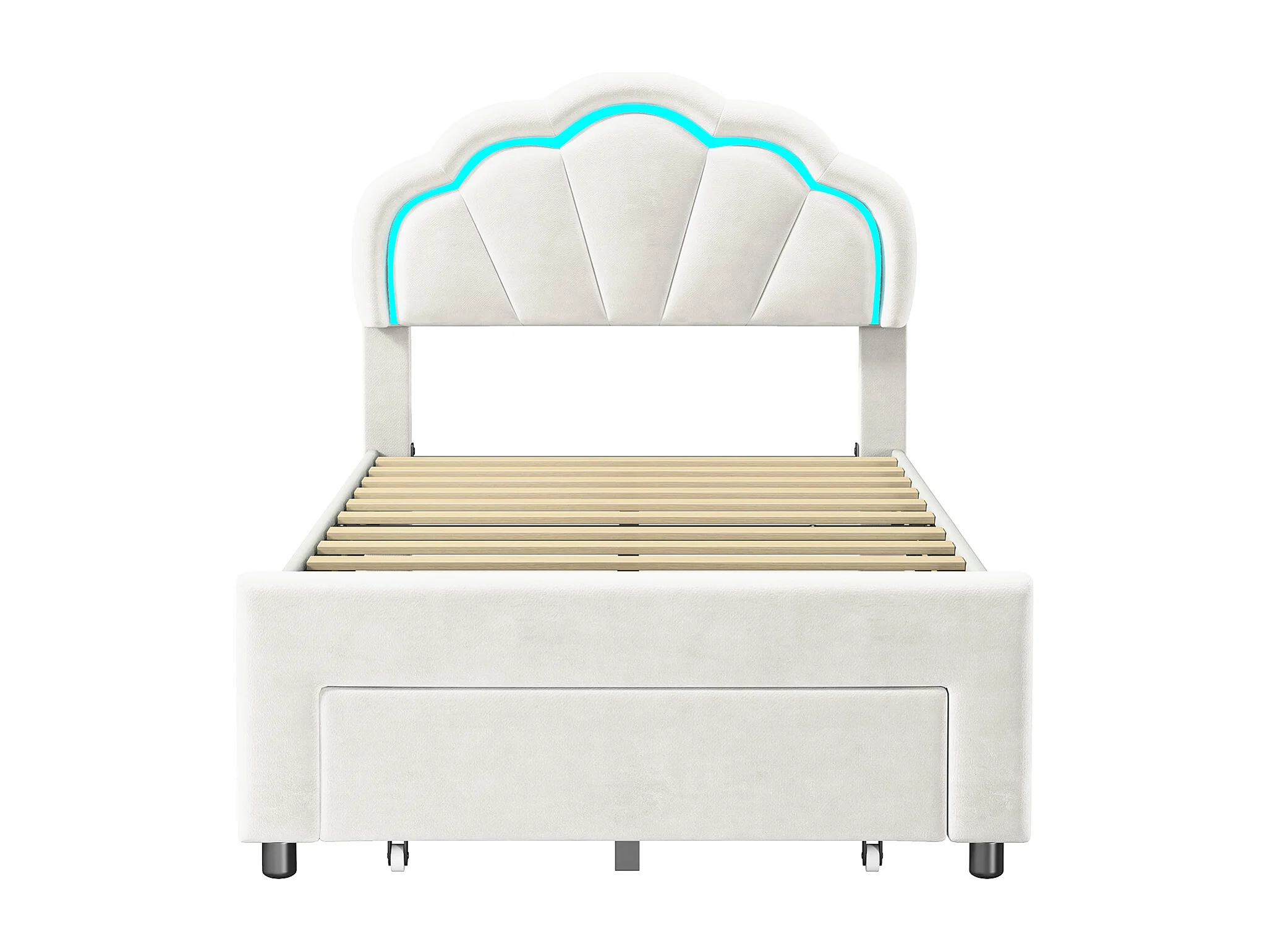 Gestoffeerd bed 90 x 200 cm, met LED, met lades, met lattenbodem, fluweel, wit