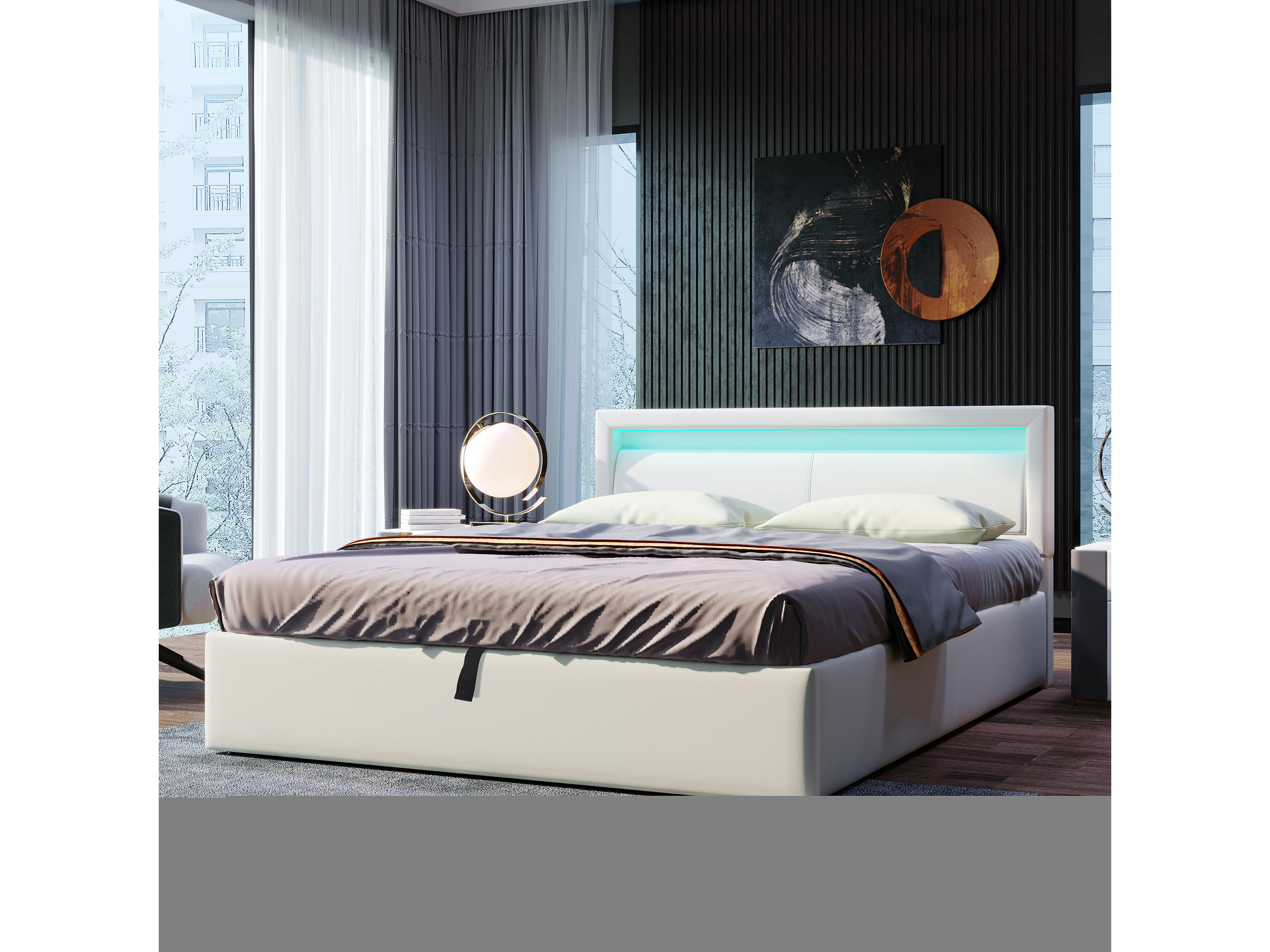 Gestoffeerd bed, LED-bed, 140x200 cm, met lattenbodem, opbergruimte en hoofdbord, kunstleer, wit, matras niet inbegrepen.