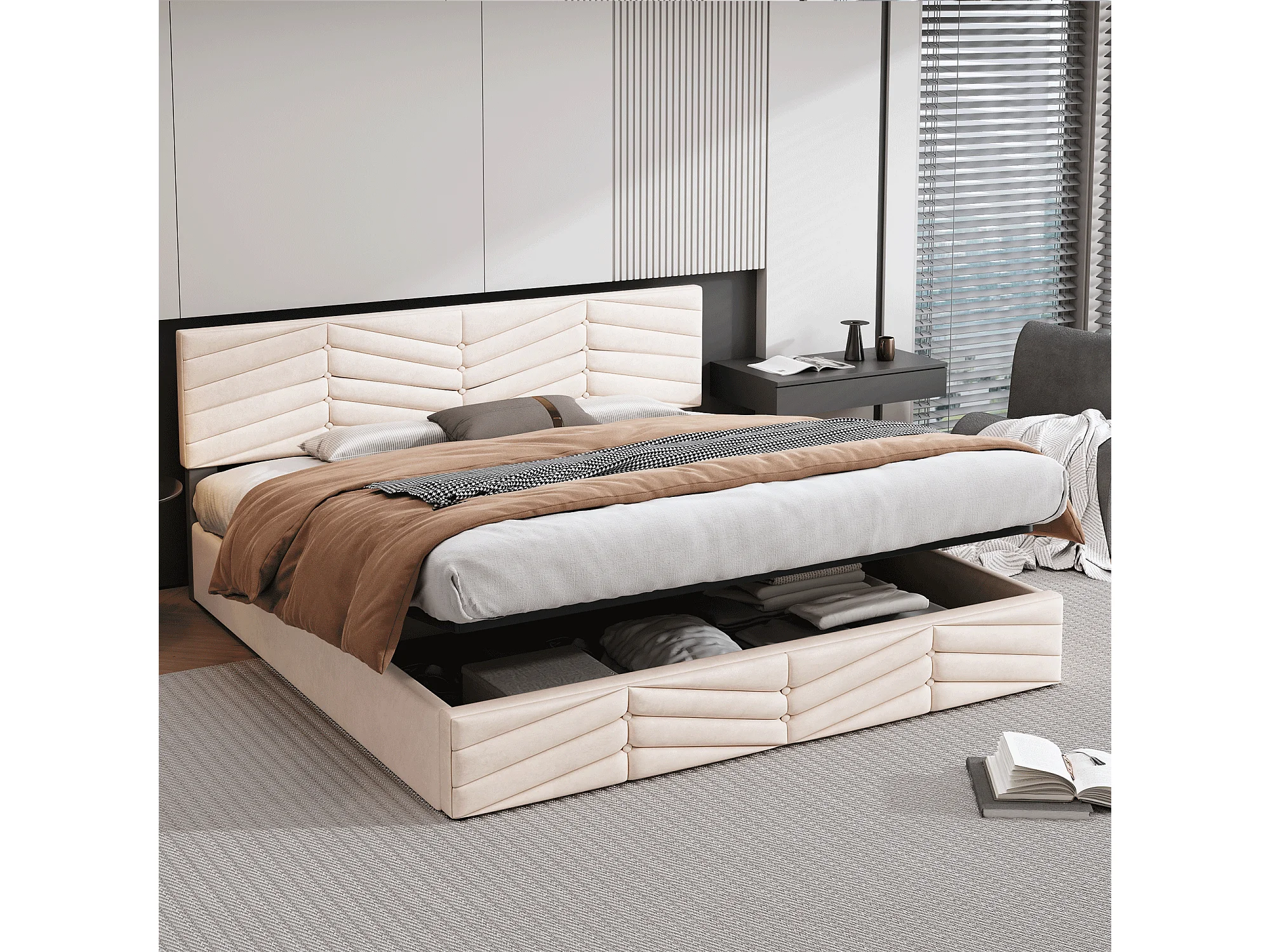 Tweepersoonsbed 160*200 cm, nachtkastje met led- en USB-aansluitingen, 4 ijzeren lades, fluweel, beige