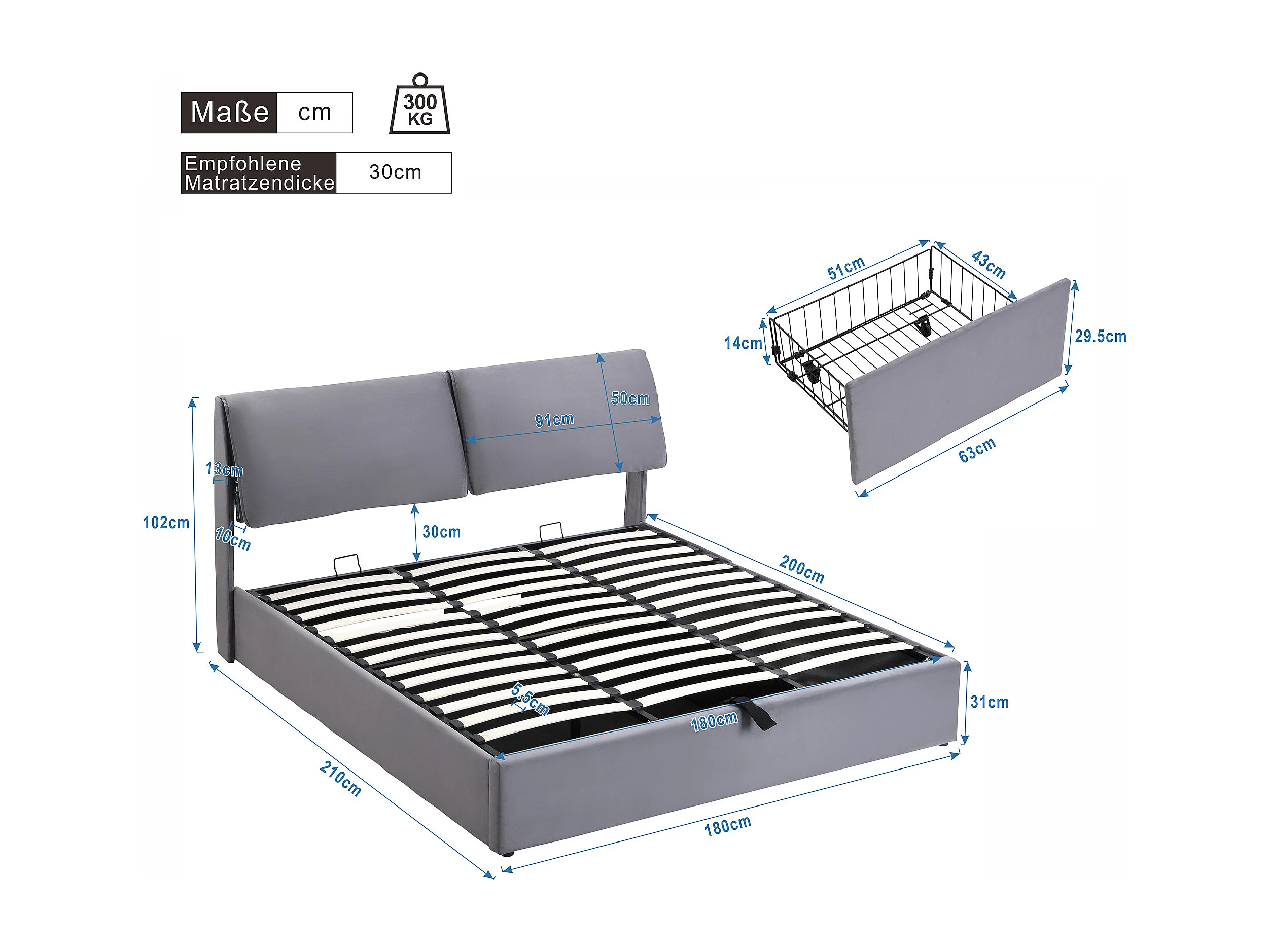 Gestoffeerd bed met opbergruimte, 180x200 cm, hydraulisch, drie laden, grijze fluwelen stof (197x31x13 cm)