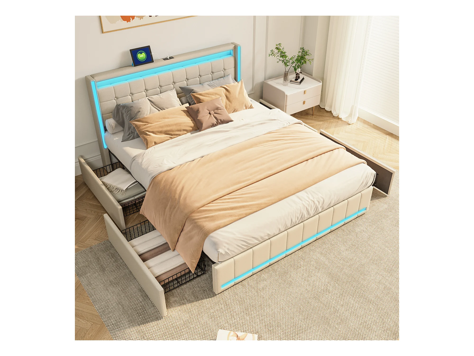 Gestoffeerd tweepersoonsbed 160x200cm met ledverlichting en 4 lades, in hoogte verstelbaar hoofdbord, lattenbodem, beige