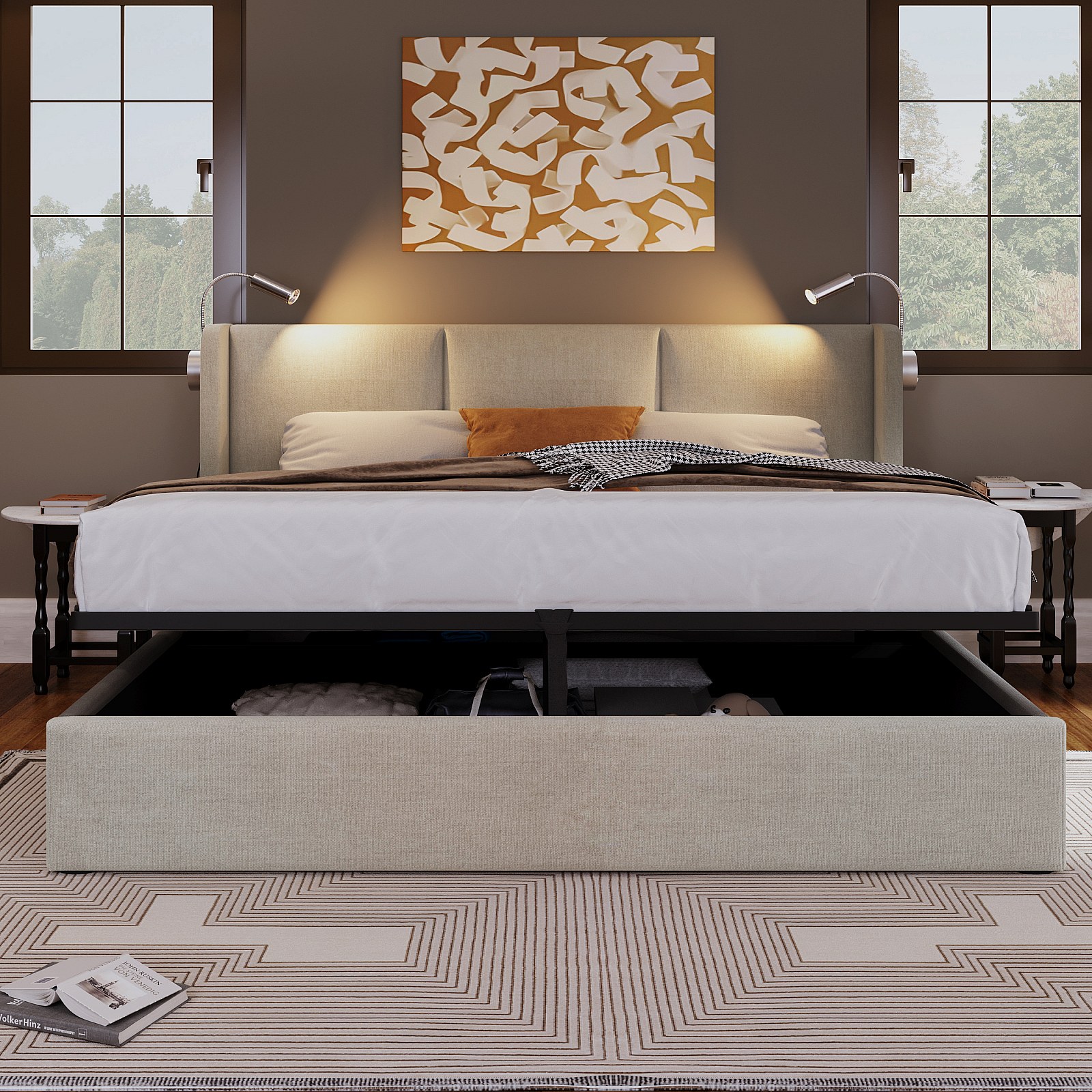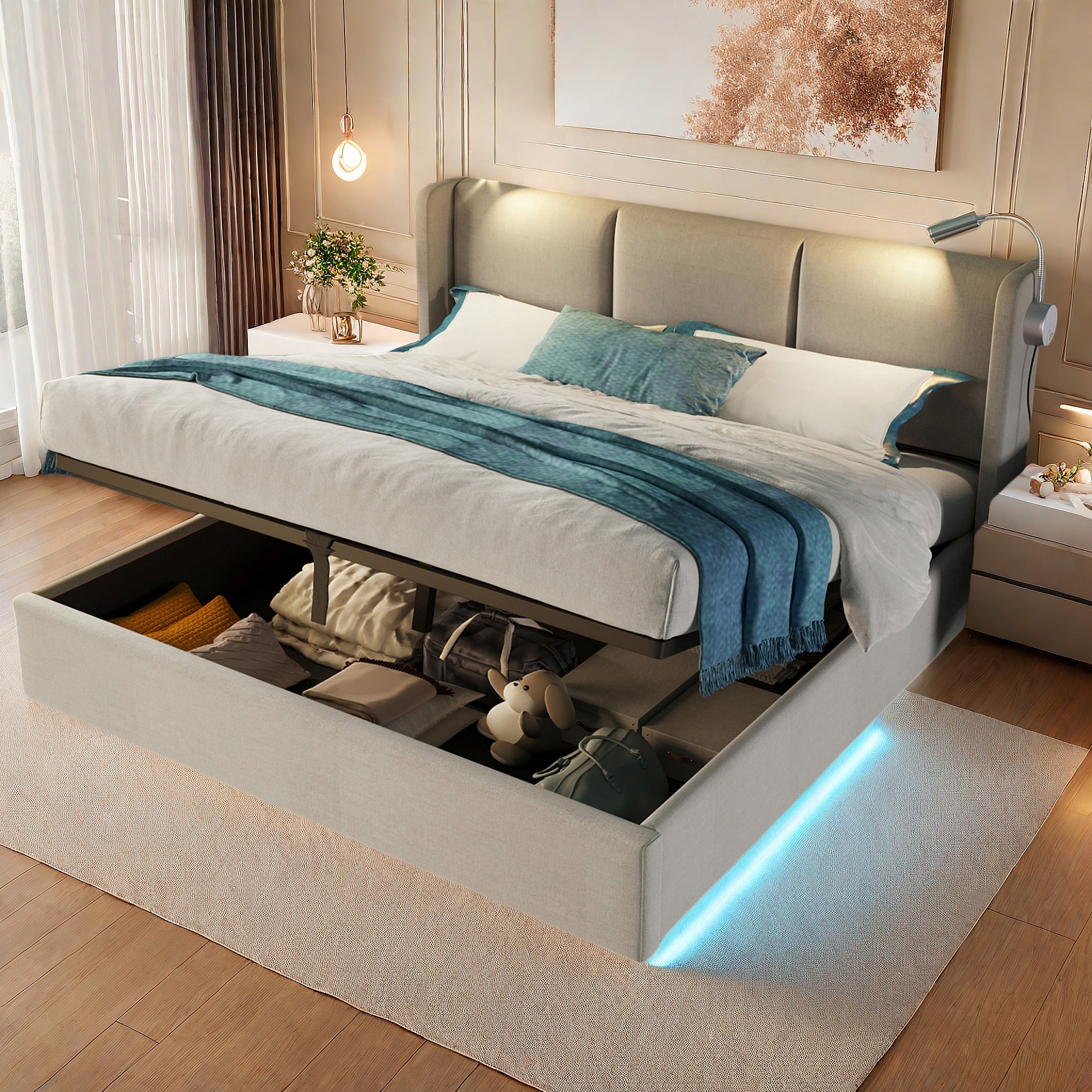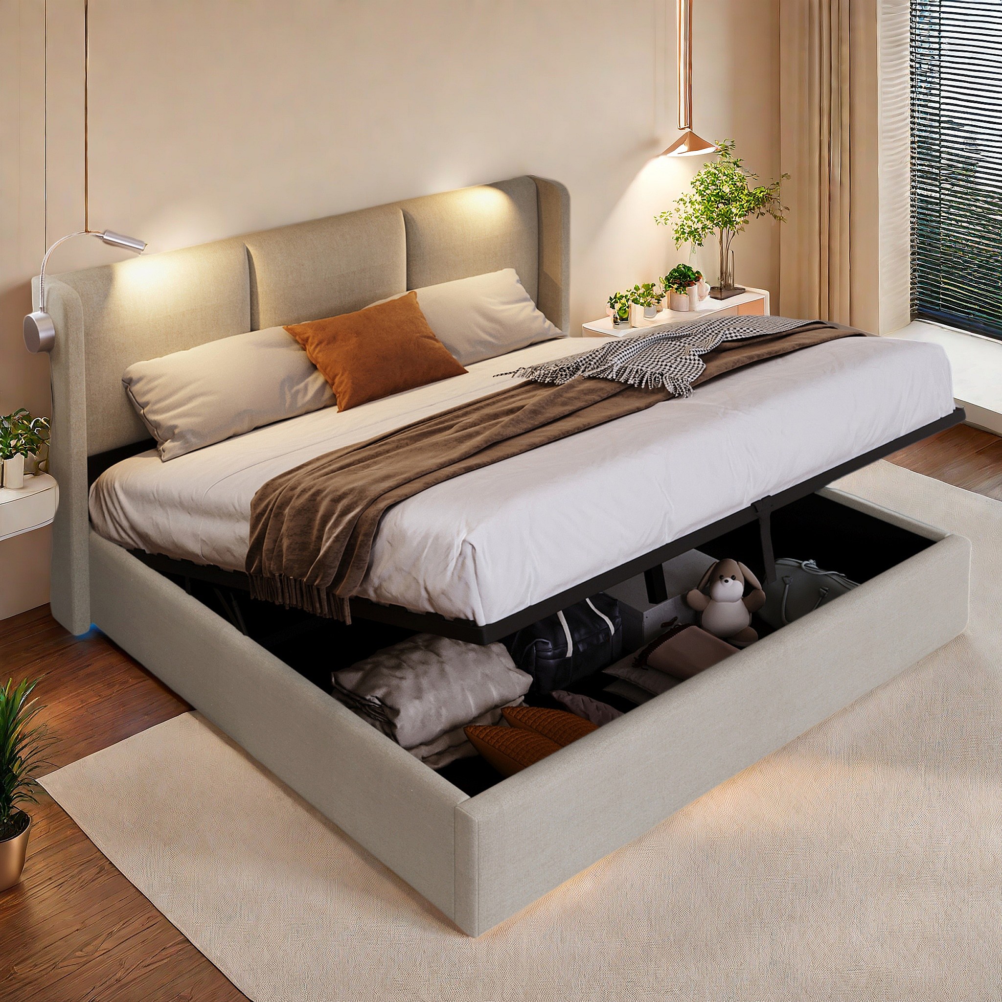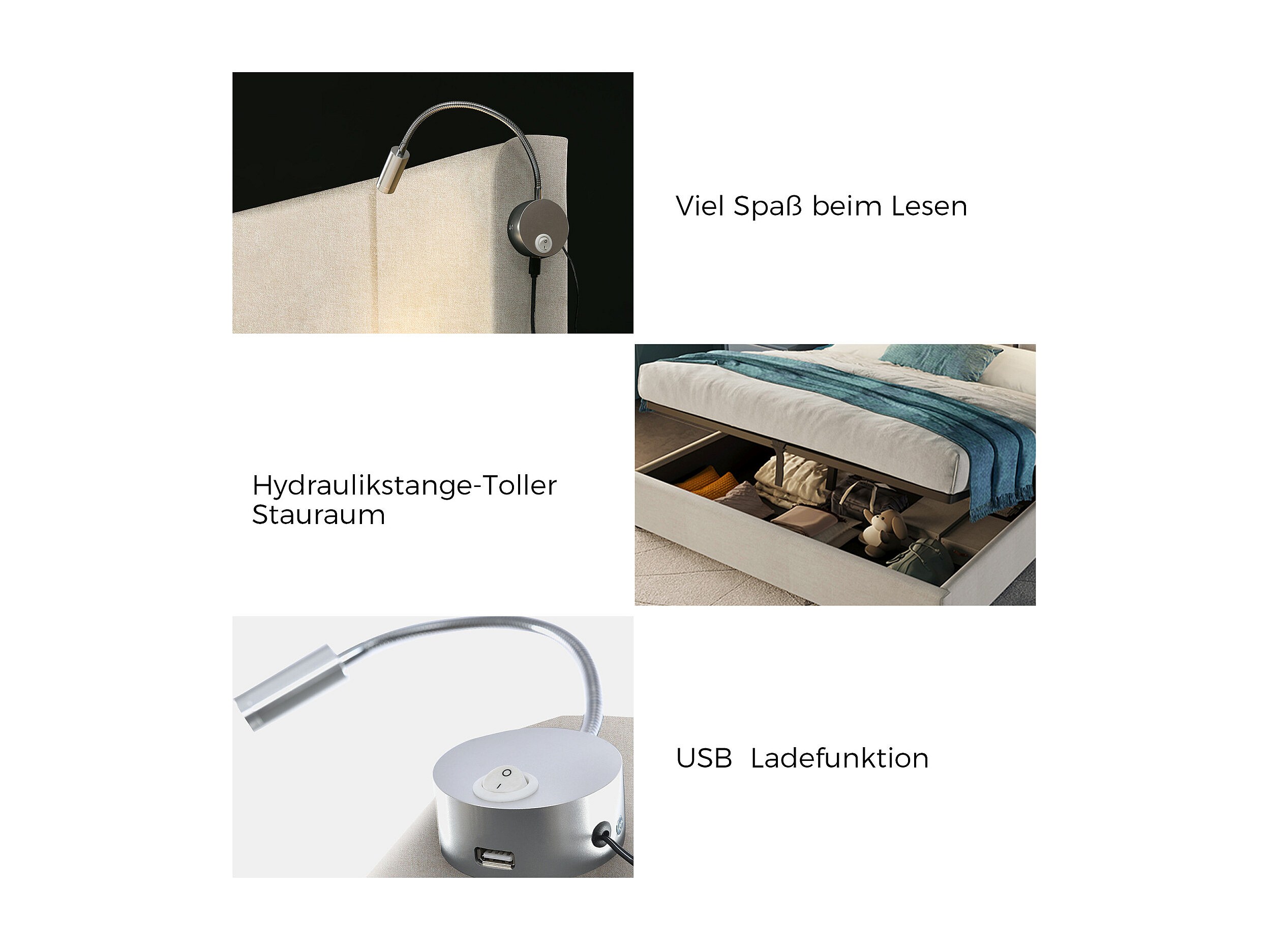 Gestoffeerd bed van 160x200 cm in beige PU met hoofdbord, lattenbodem, hydraulisch opbergvak en leeslampjes met oplaadaansluitingen (zonder matras)