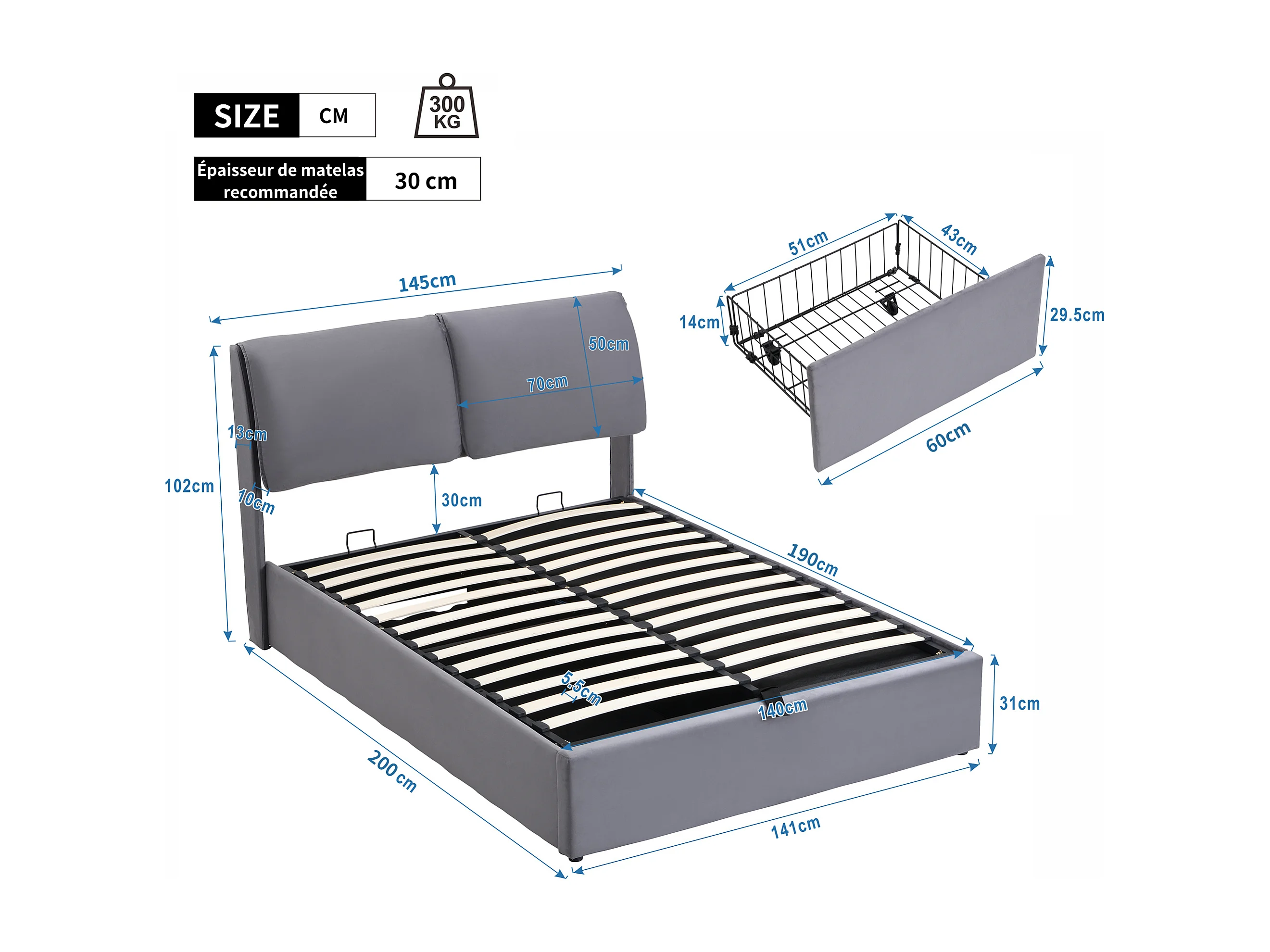 Gestoffeerd hydraulisch bed 140x190cm, met drie lades, opbergvak, lattenbodem en hoofdeinde, fluweel, grijs, matras niet inbegrepen.