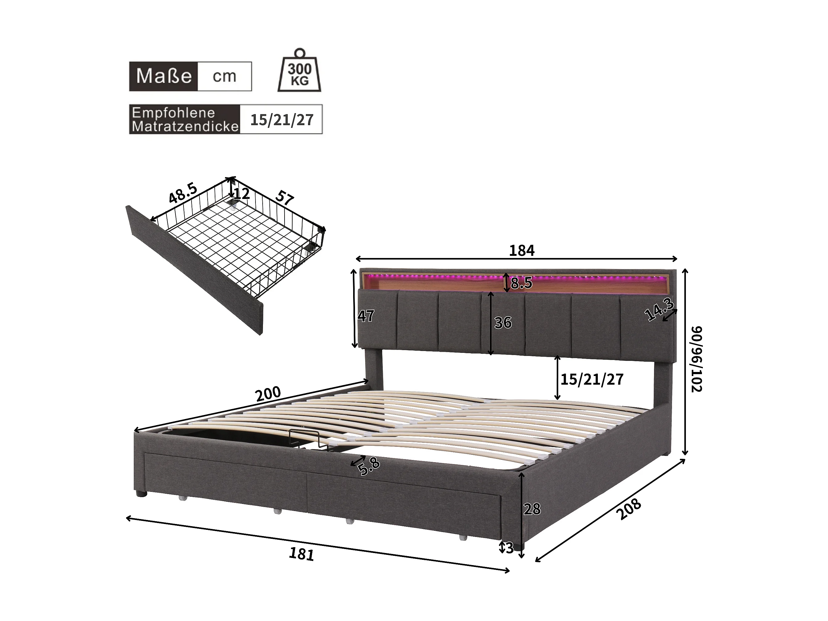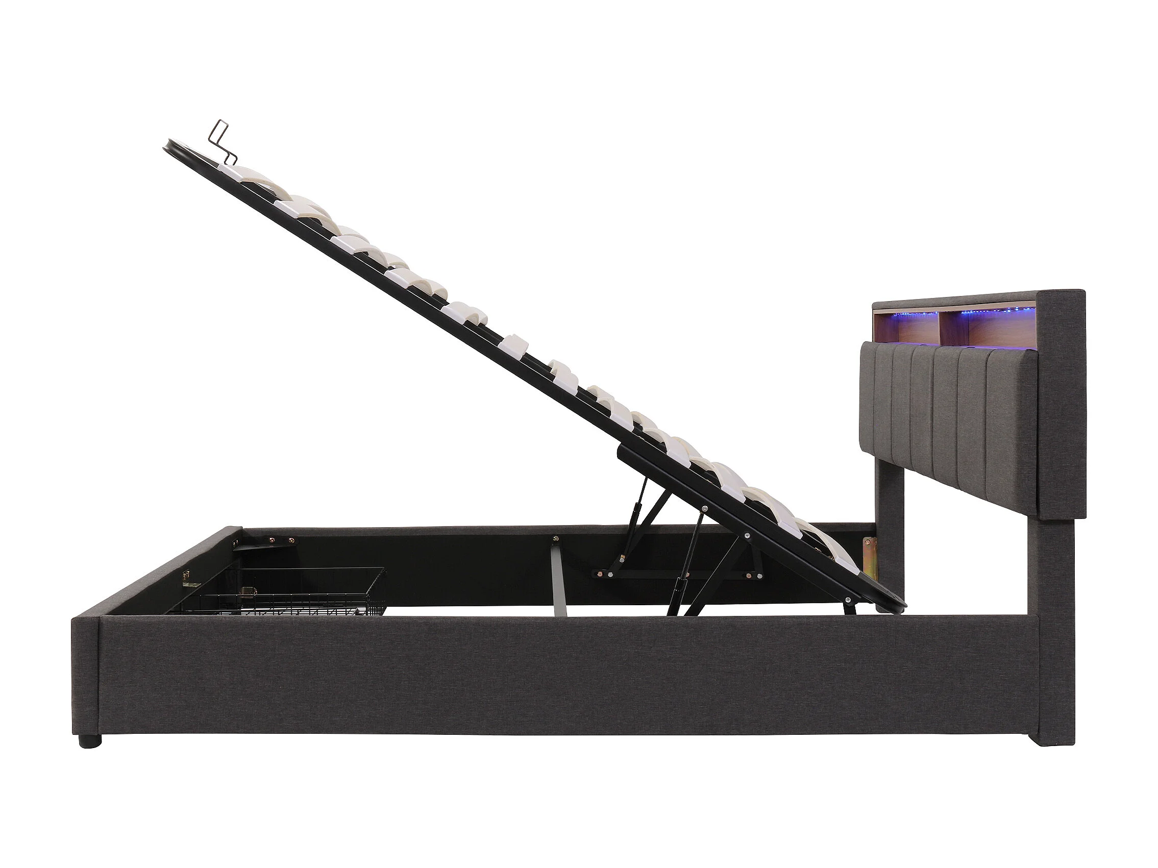 Gestoffeerd hydraulisch bed 180x200cm, met ledverlichting, lades en opbergvakken, tweepersoonsbed, grijs, matras niet inbegrepen