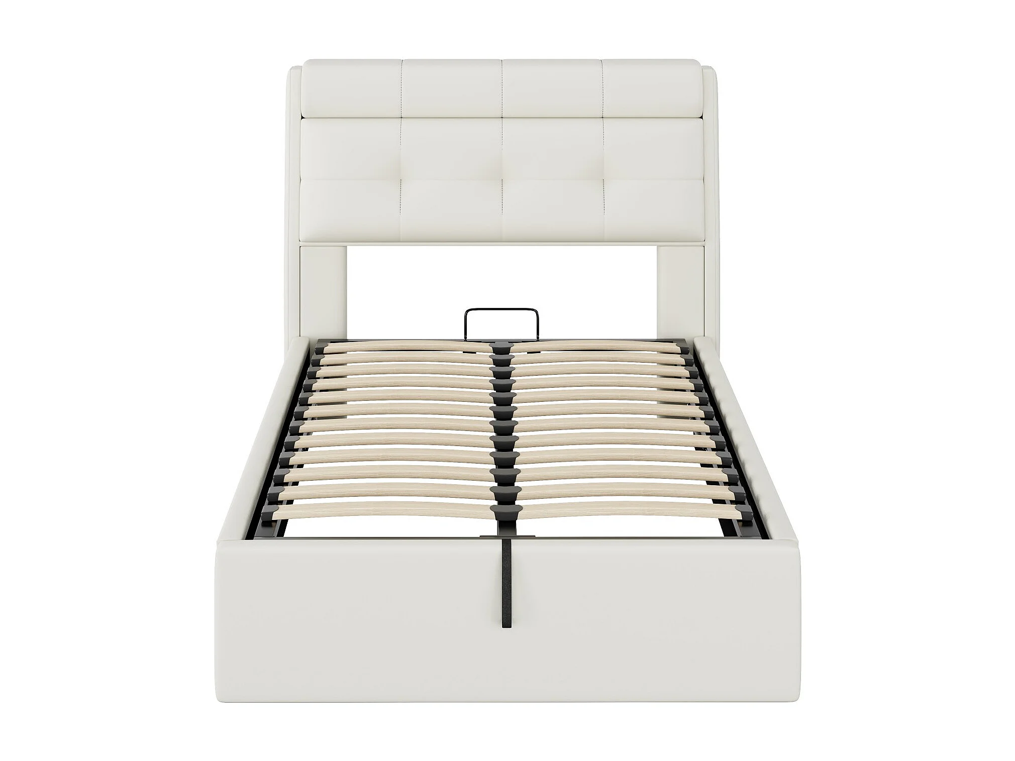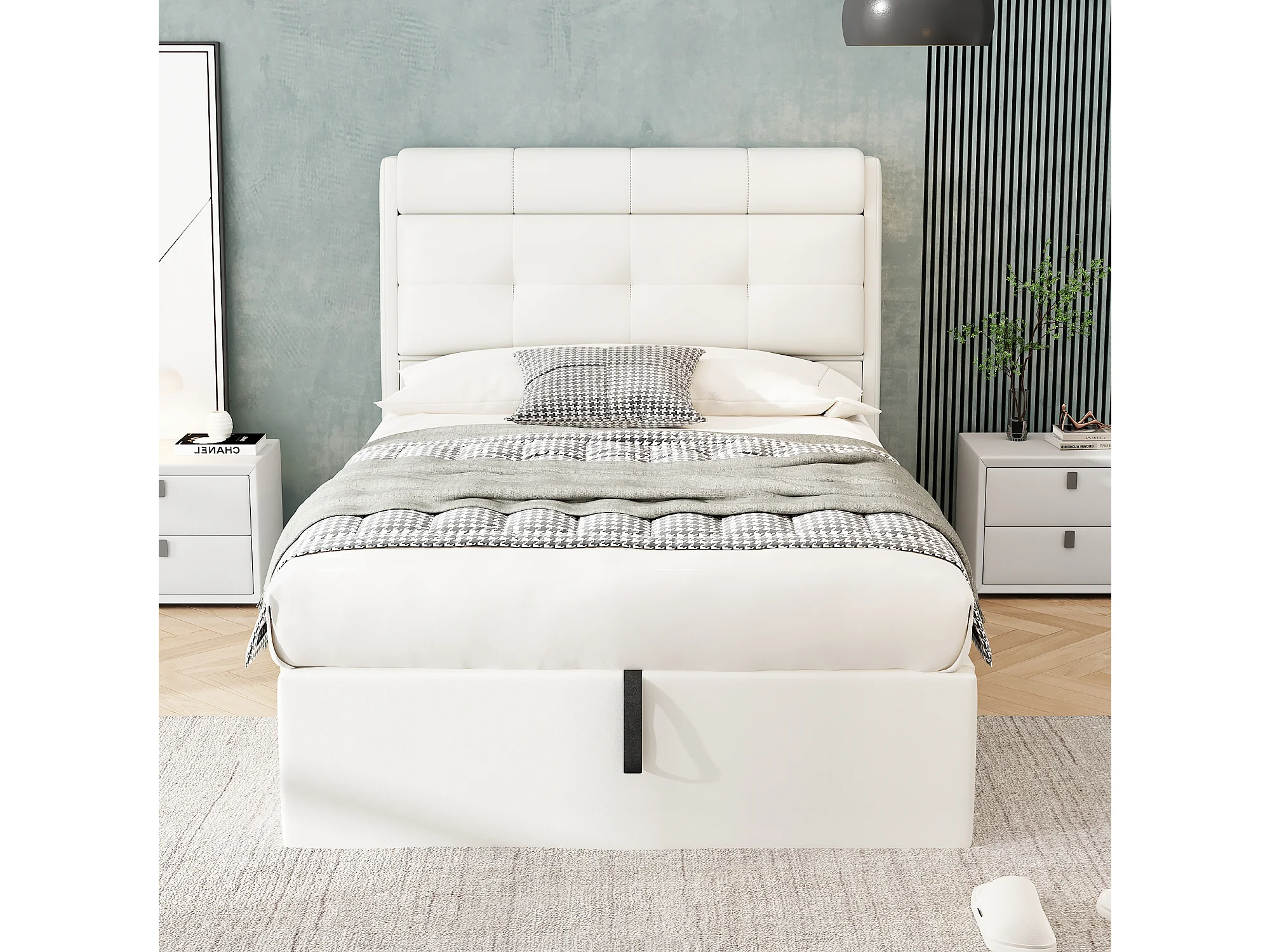 Gestoffeerd hydraulisch bed 90x200cm, met verborgen hoofdbordplank en lattenbodem, polyurethaan, wit, matras niet inbegrepen
