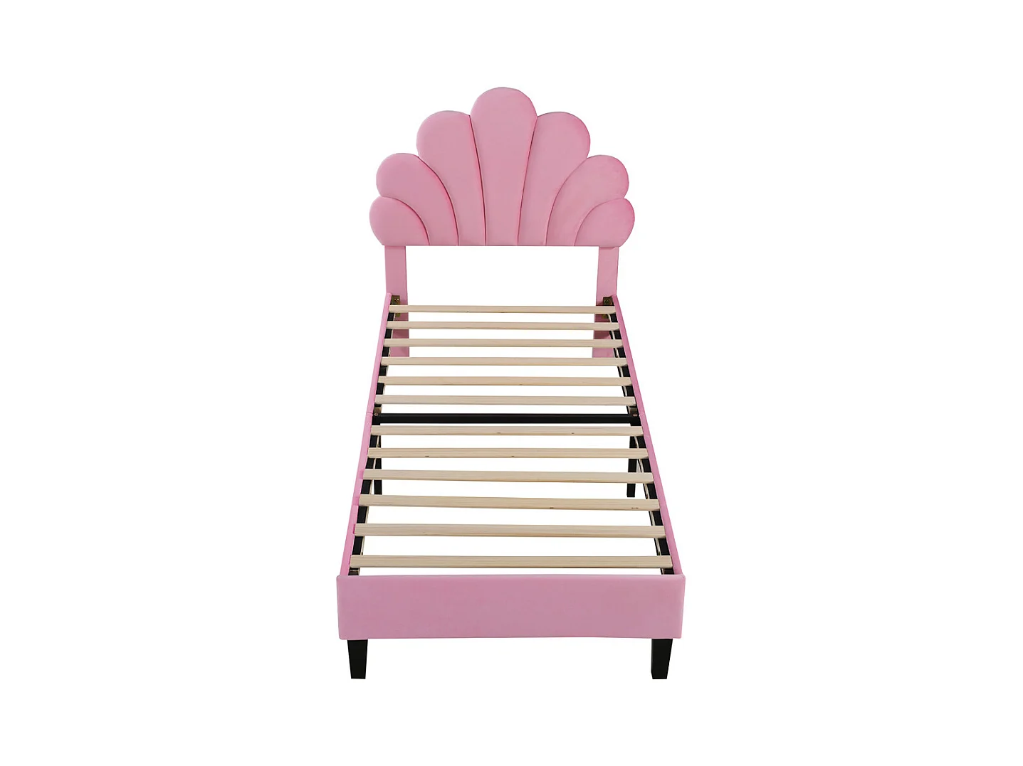 Gestoffeerd kinderbed 90x200 cm, bedframe met bloemvormig hoofdbord en lattenbodem, fluwelen stof, roze