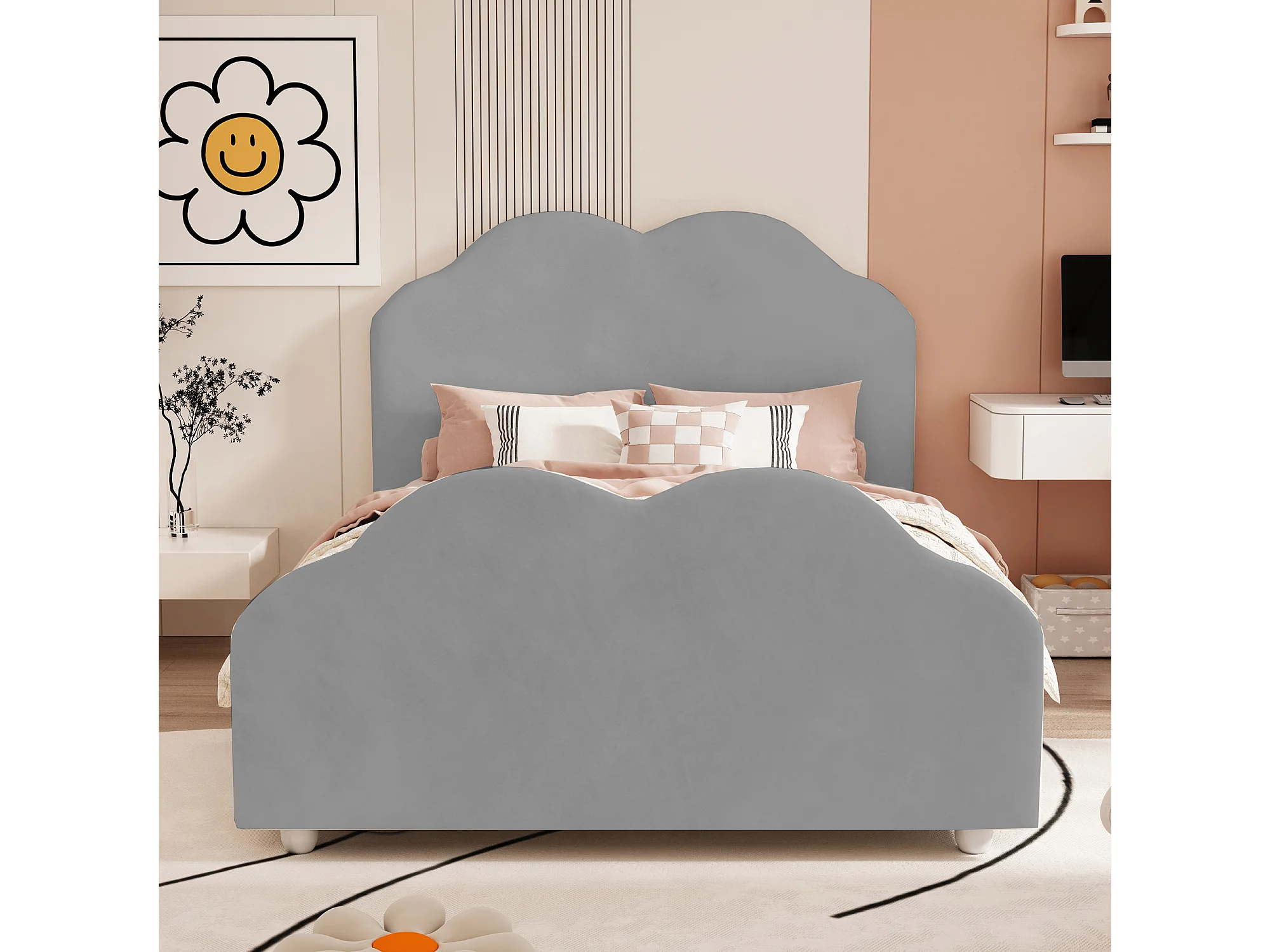 Gestoffeerd kinderbed 90x200 cm met hoge spijlen, hoofd- en voeteneinde in de vorm van een wolk, grijs fluweel (207,5x95x107,5 cm)