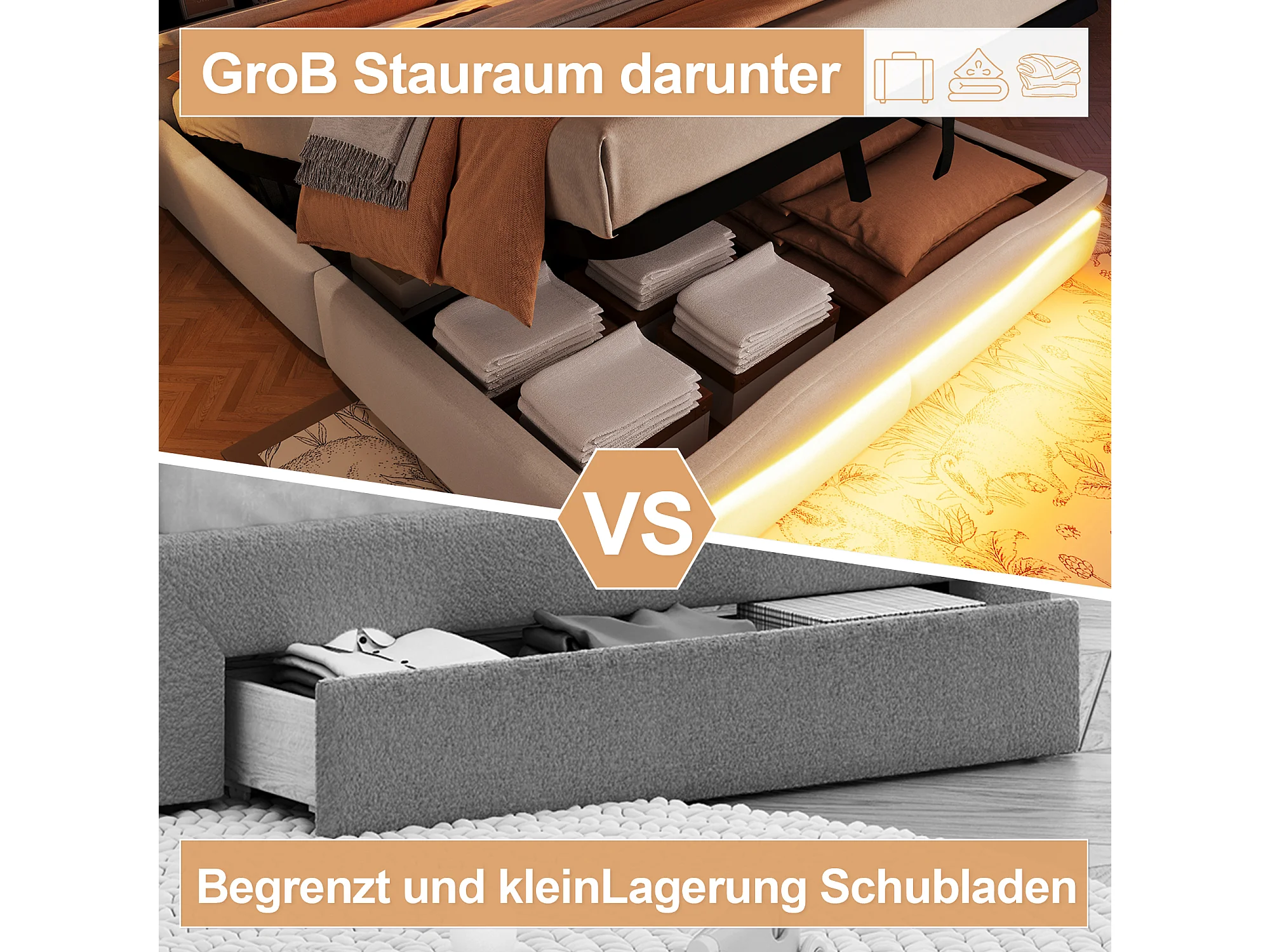 Gestoffeerd opbergbed - 160 x 200 cm - met USB-C + LED-verlichting - hoofdbord met opbergruimte - linnen + MDF - beige