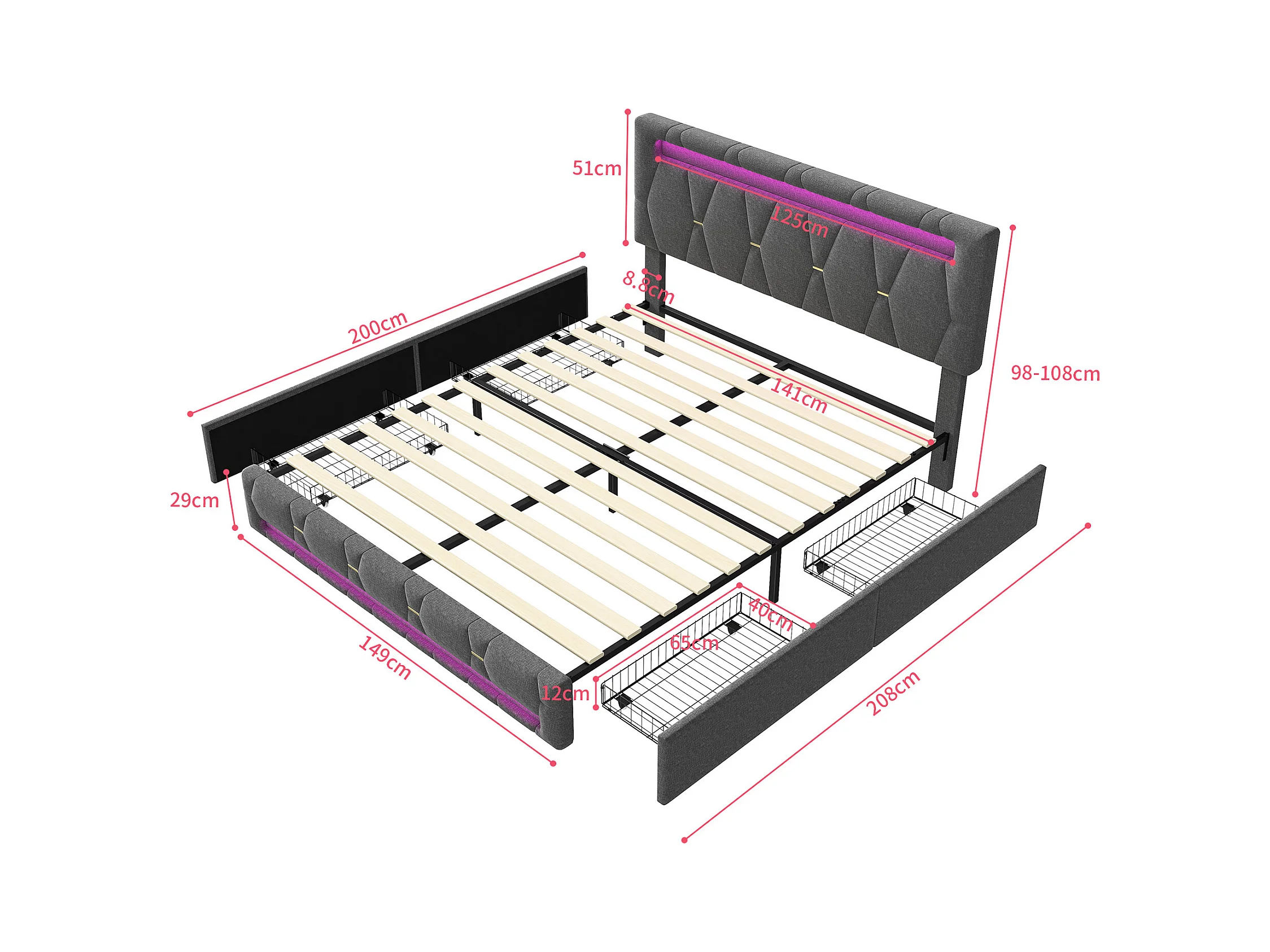 Bedbodem 140x200 LED en 2 USB, Type-C, gestoffeerd tweepersoonsbed met 4 lades, linnen, grijs