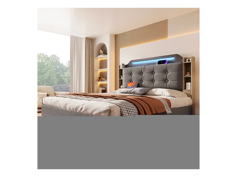 Gestoffeerd tweepersoonsbed 140 x 200 cm, met ledstrip, hydraulische opbergruimte, opbergvakken, USB- en Type-C-aansluitingen, linnen stof, grijs