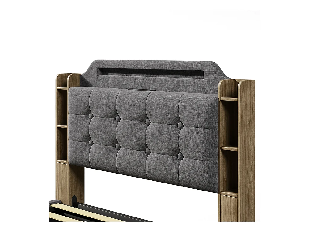 Bed met opbergruimte 140x200 cm, hoofdbord met opbergruimte en USB-aansluiting, grijs hout - zonder matras