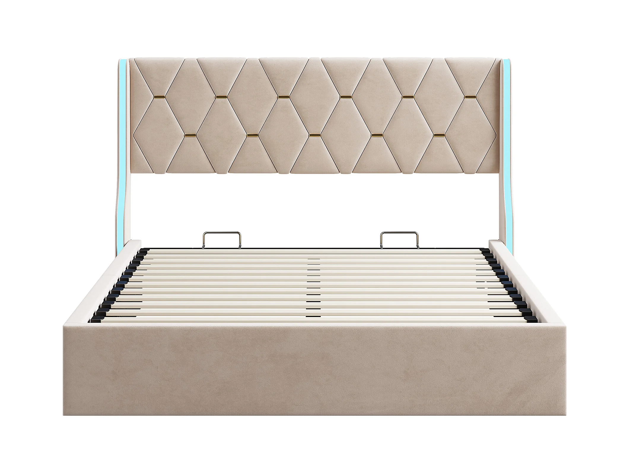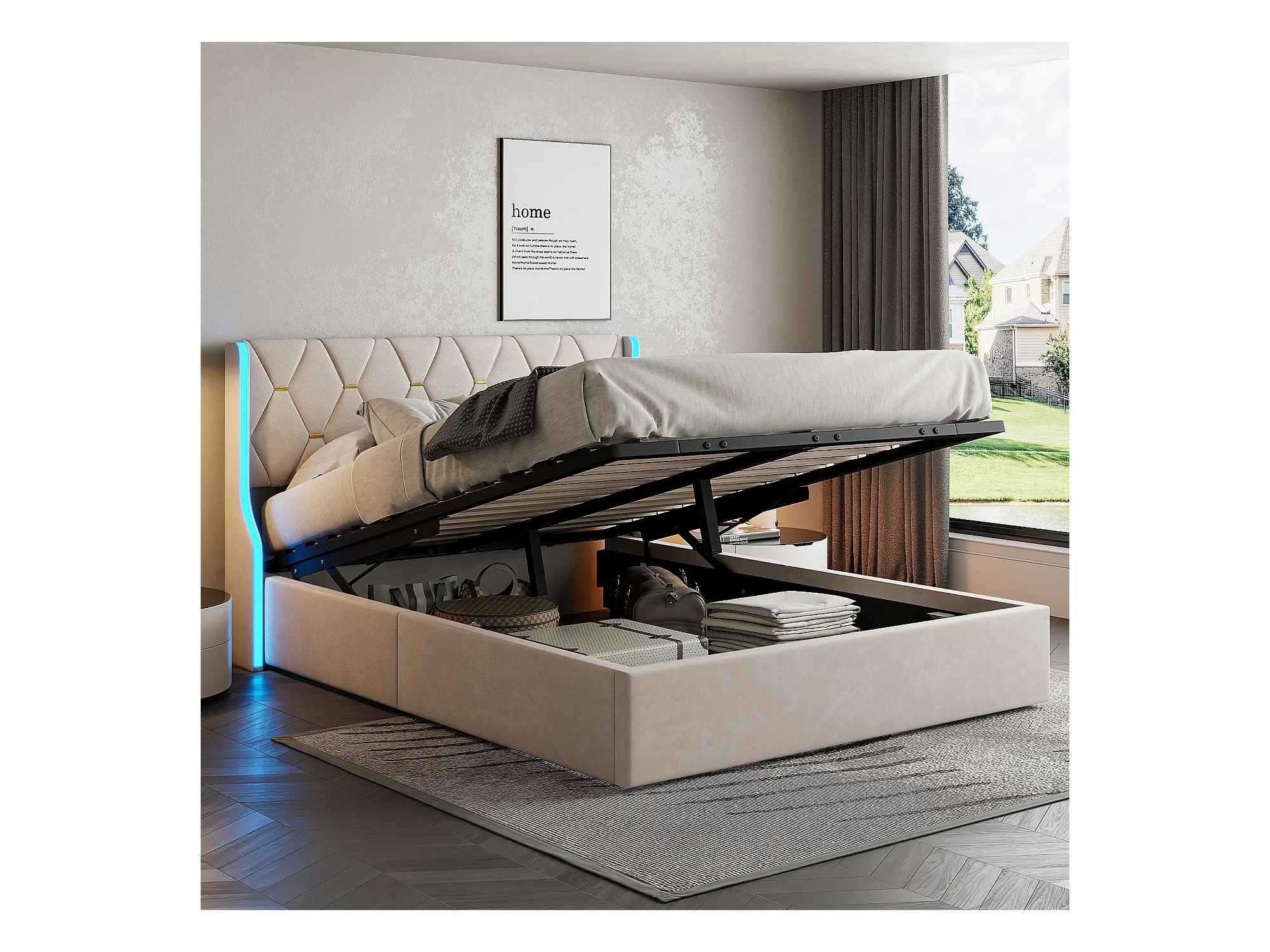 Gestoffeerd tweepersoonsbed 160 x 200 cm met LED-hoofdbord, opbergbed met lattenbodem en bedstee, PU, grijs