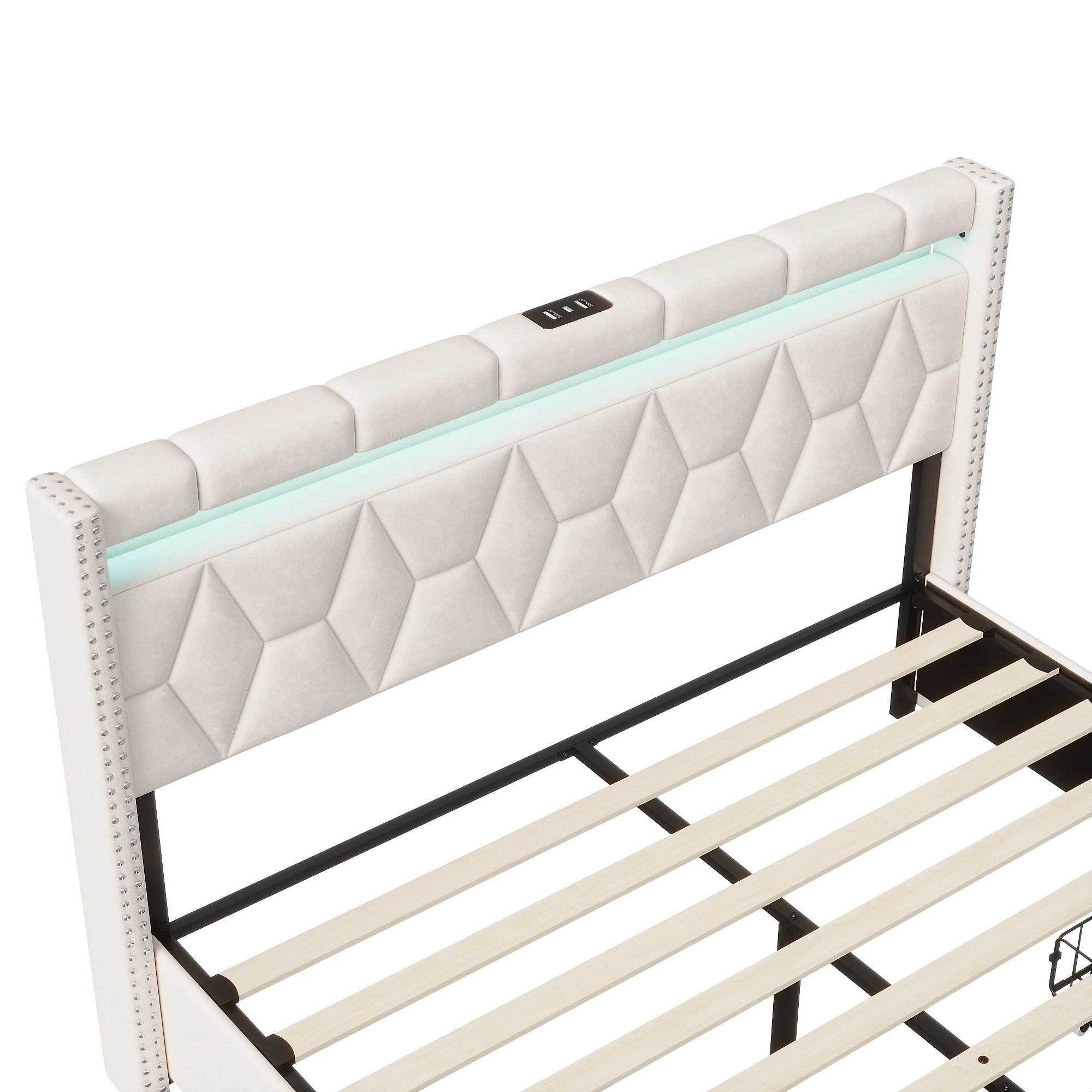 Gestoffeerd tweepersoonsbed 160x200cm met 4 lades en LED, USB, bedframe, beige linnen