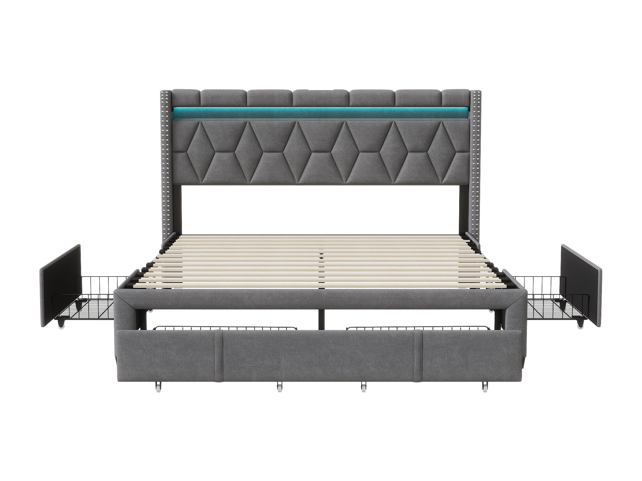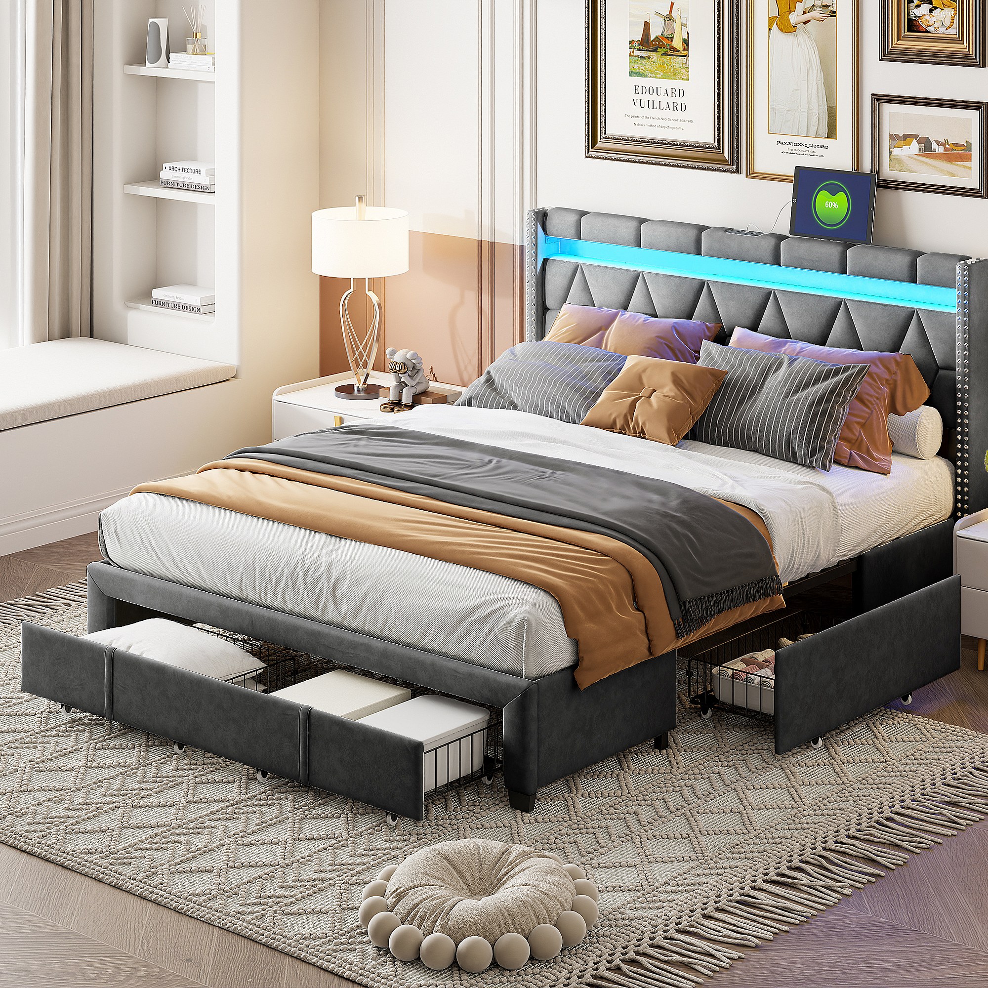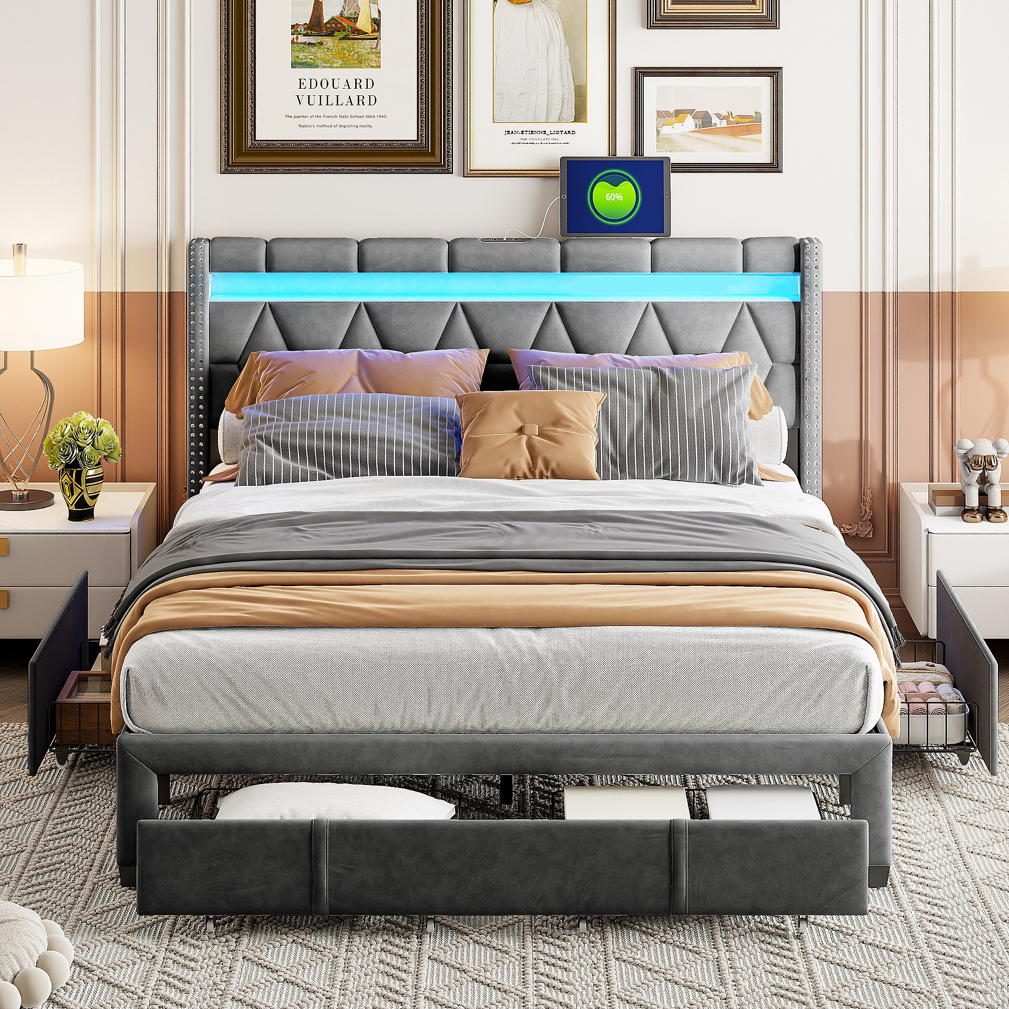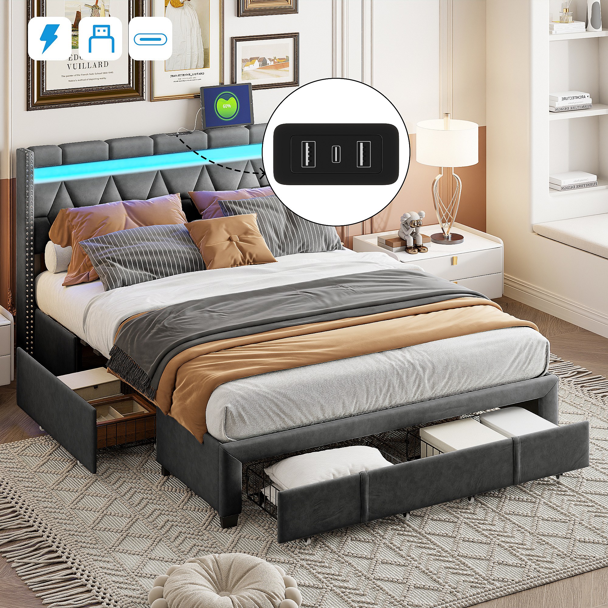 Gestoffeerd tweepersoonsbed 160x200cm met 4 lades en LED, USB, bedframe, grijs linnen