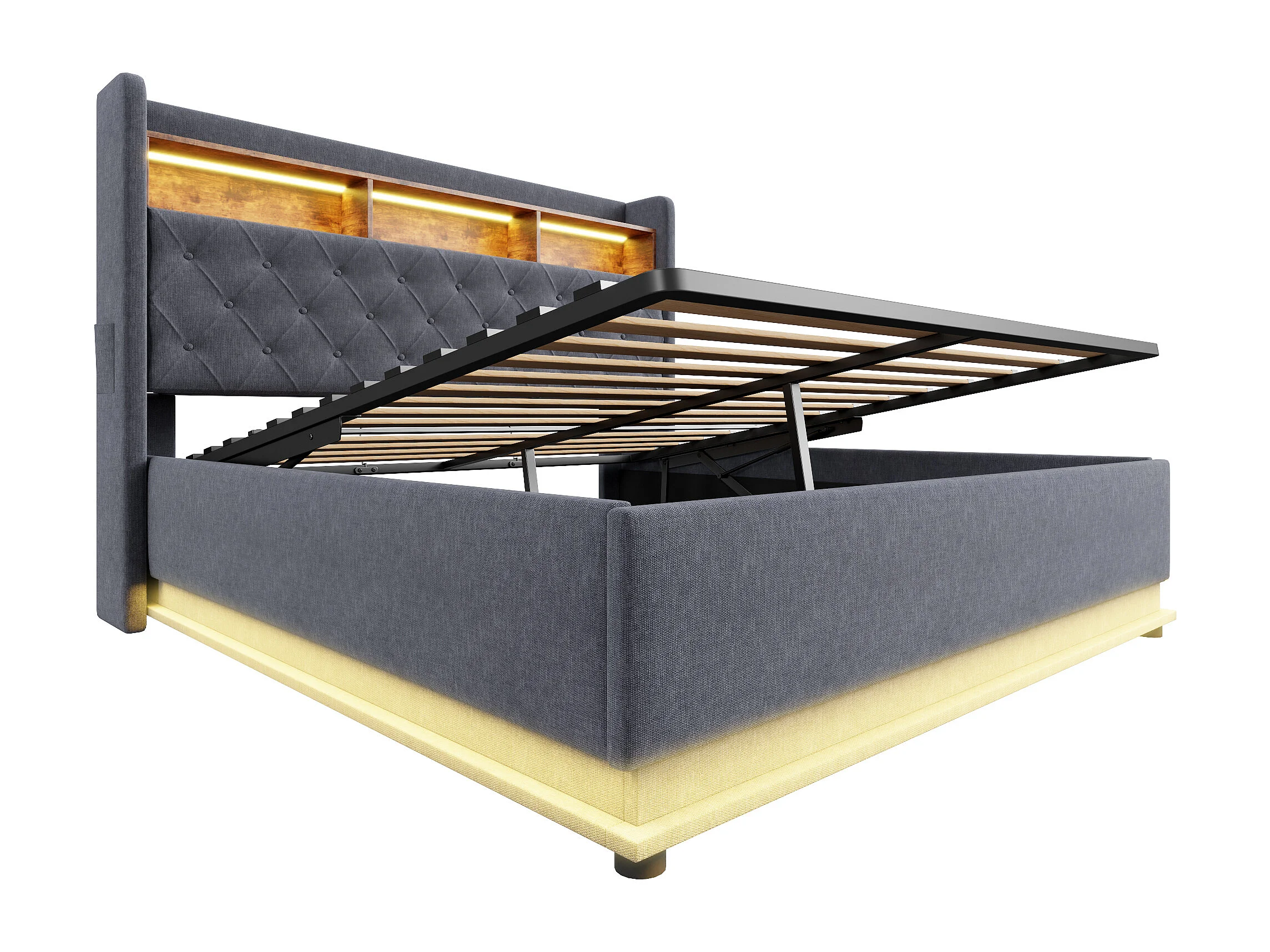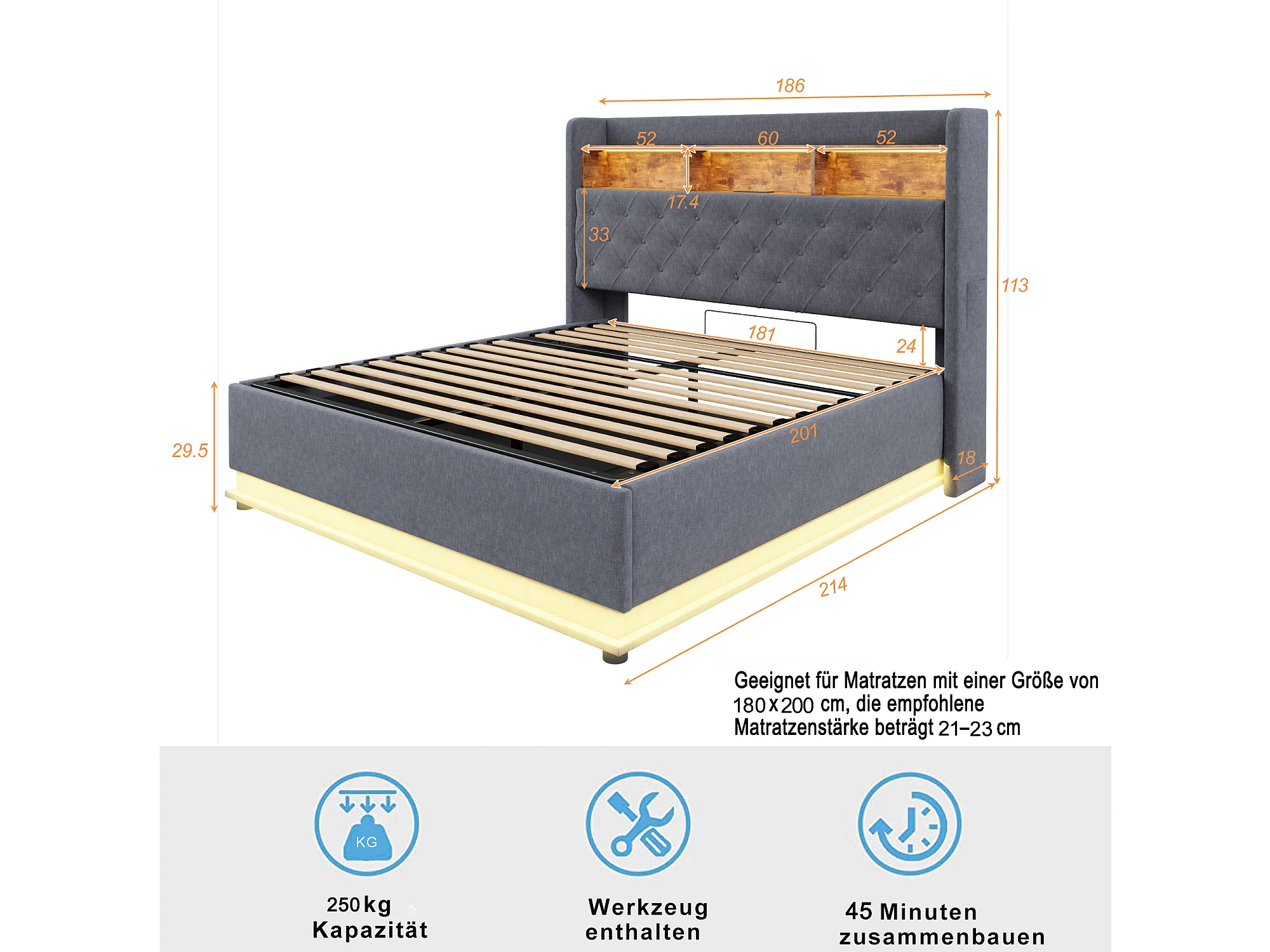 Gestoffeerd tweepersoonsbed, 180 x 200 cm, met hydraulische opberging, LED, lattenbodem, grijs