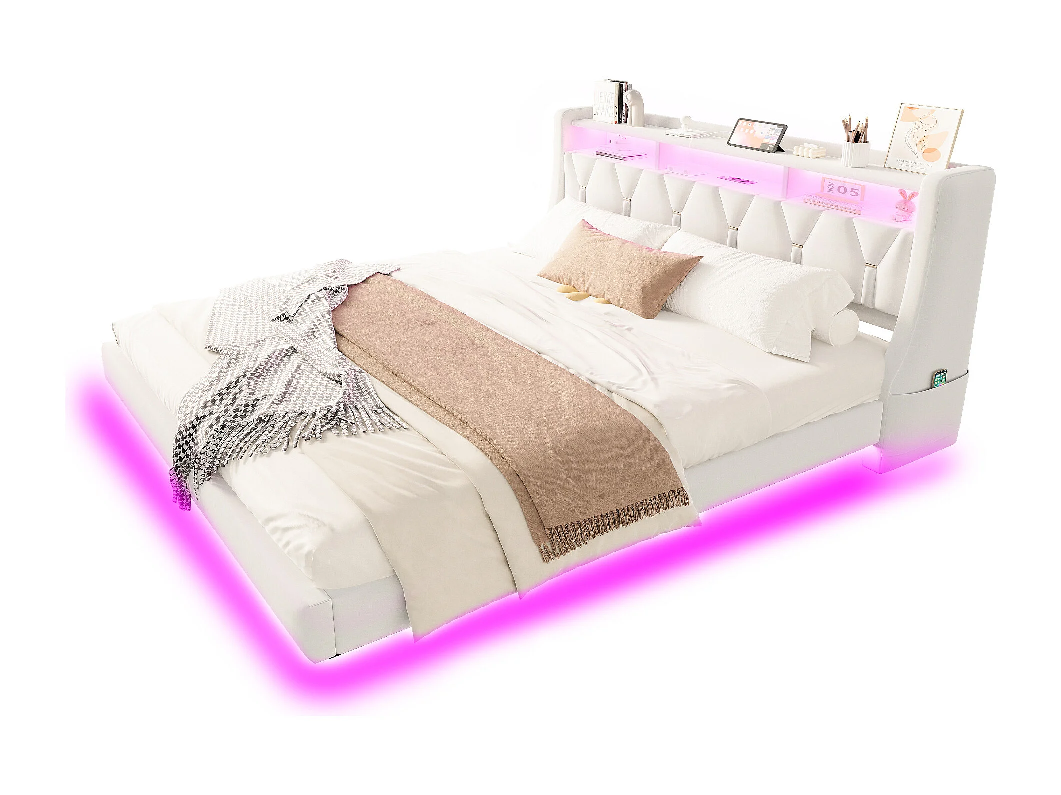 Gestoffeerd tweepersoonsbed - 180 x 200 cm - neerklapbaar gestoffeerd hoofdeinde met opbergruimte + LED-verlichting - MDF - beige