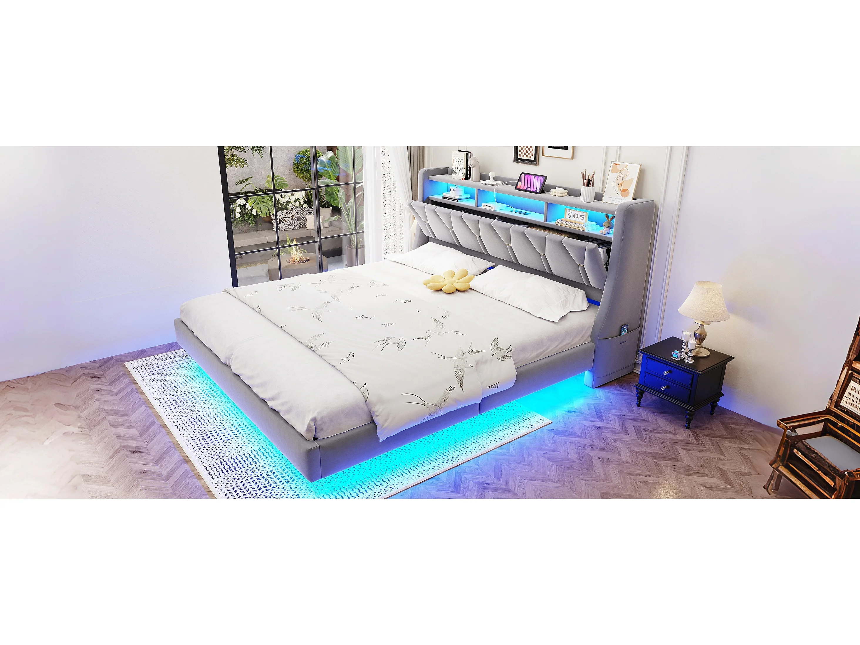Gestoffeerd tweepersoonsbed - 180 x 200 cm - neerklapbaar gestoffeerd hoofdeinde met opbergruimte + LED-verlichting - MDF - lichtgrijs