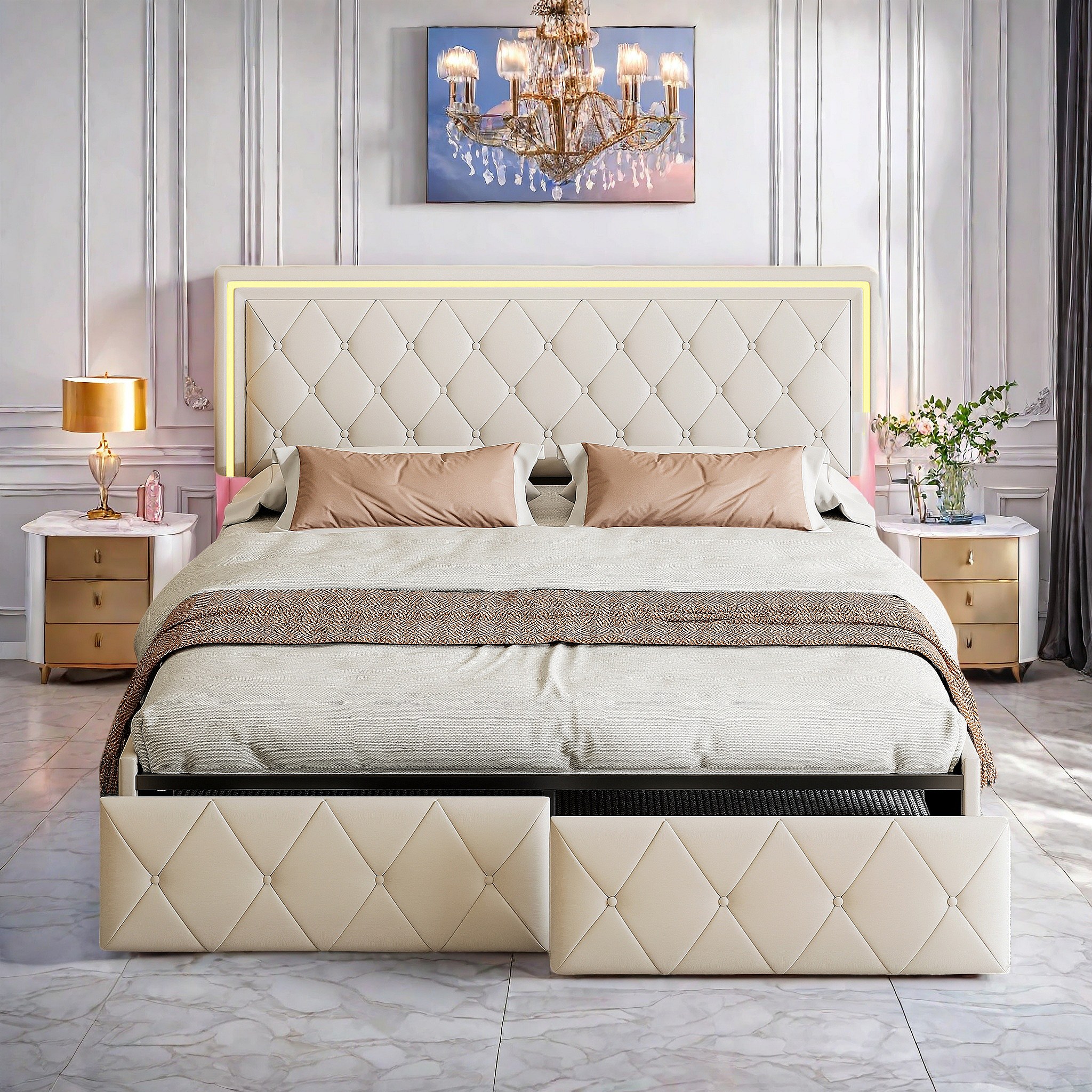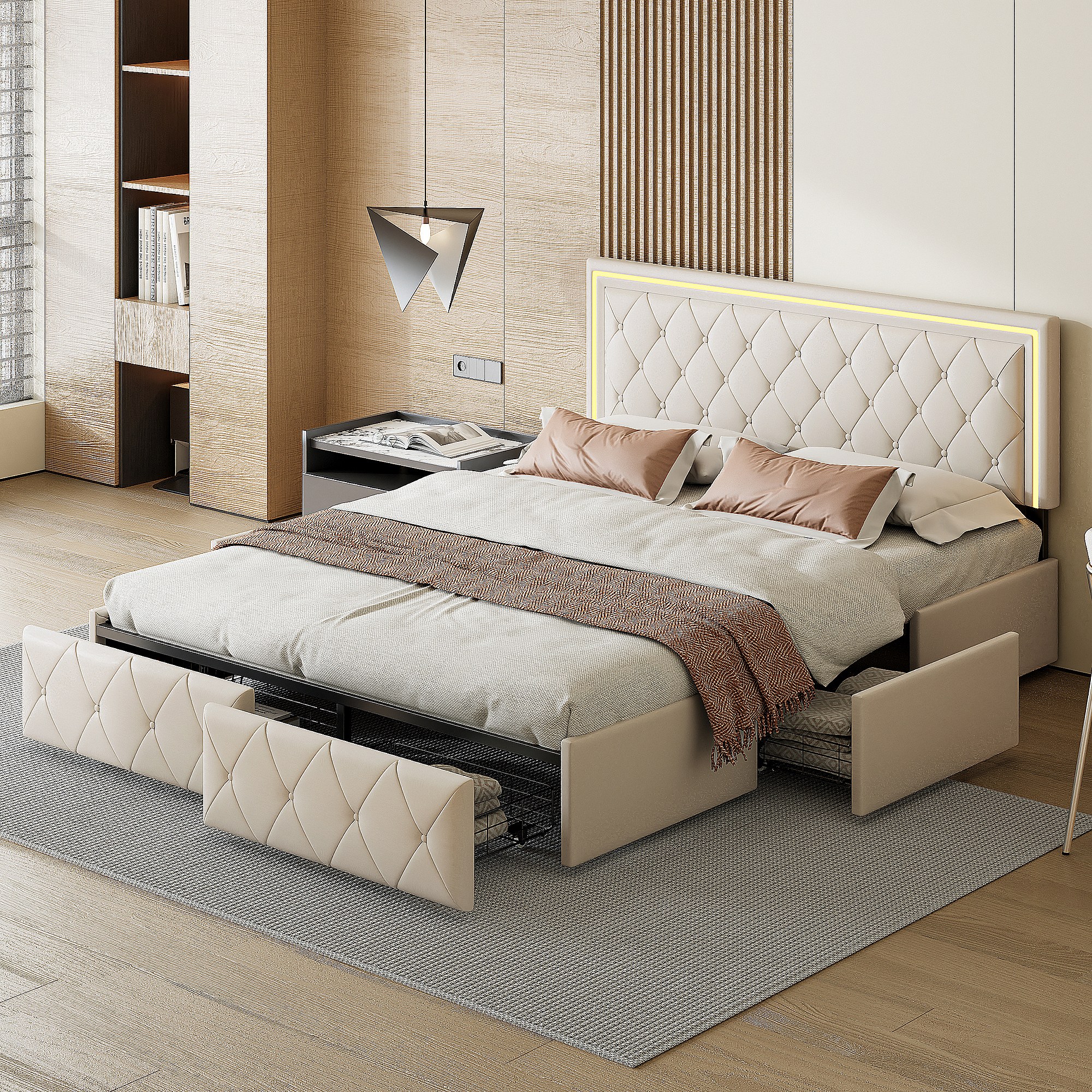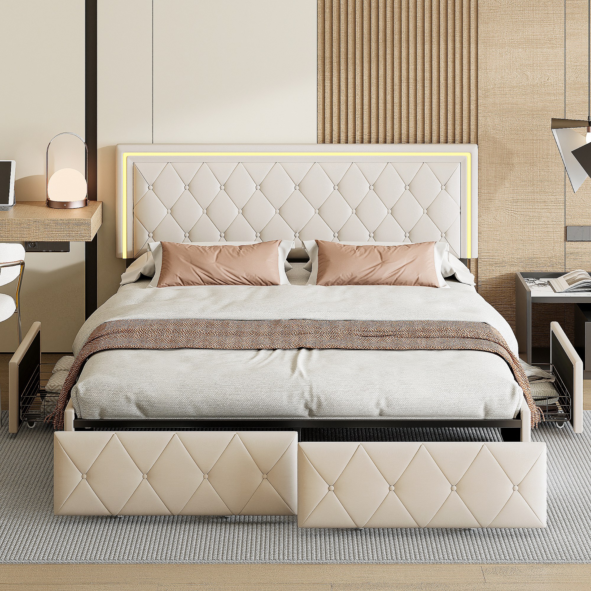 Bed van 140x200 cm met ruitvormig hoofdbord, ledverlichting en USB-aansluitingen, 4 metalen lades, beige linnen bekleding, modern en praktisch design