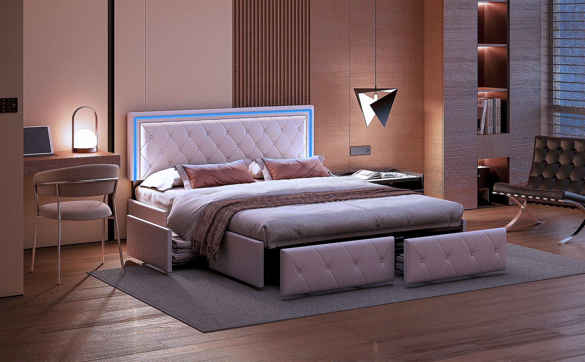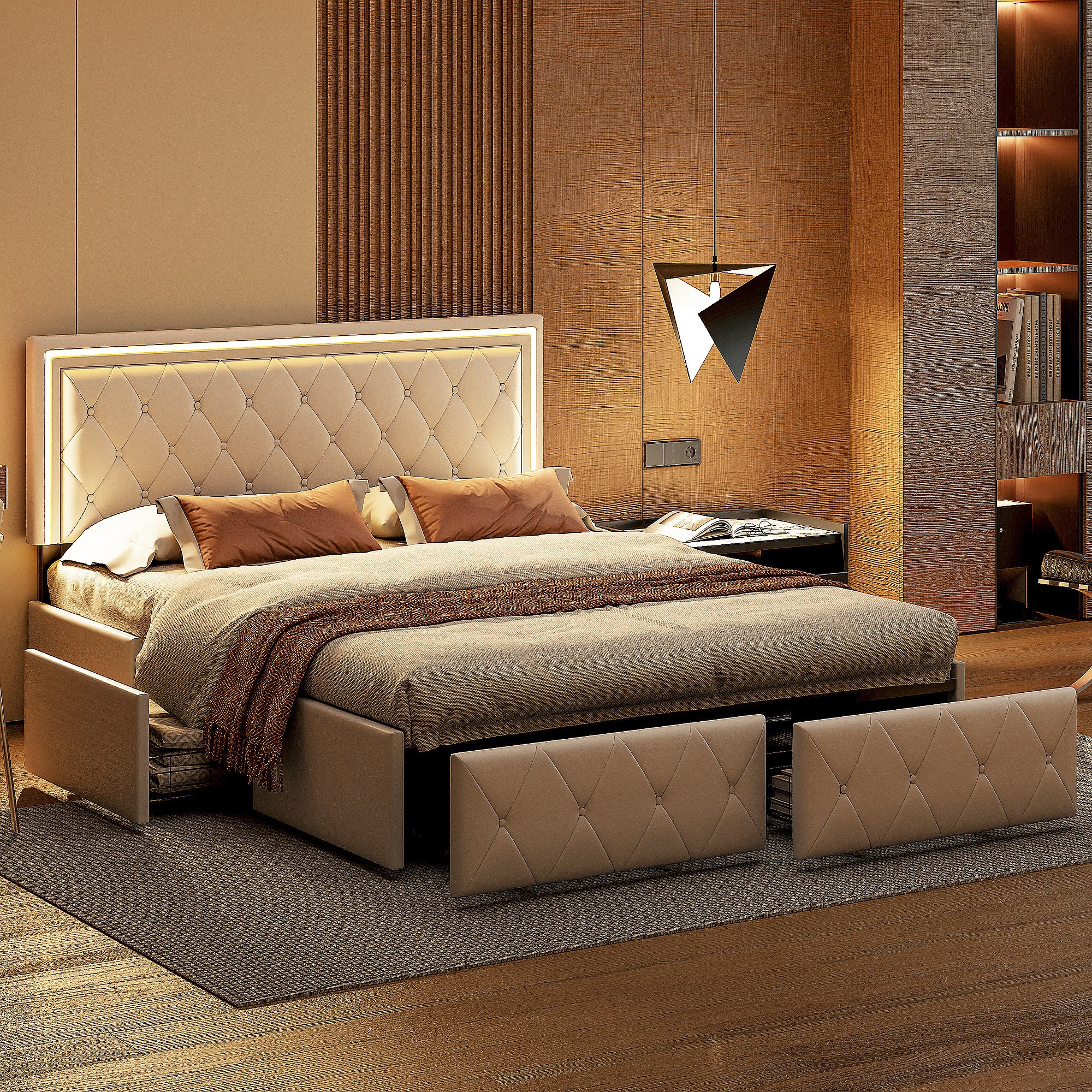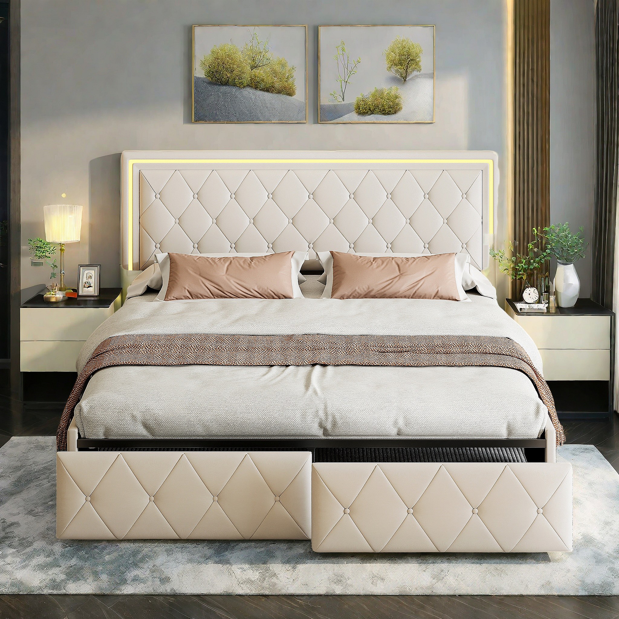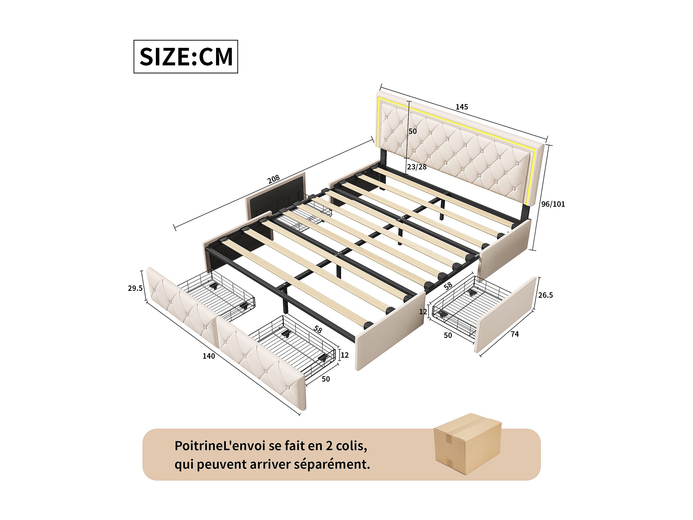 Bed van 140x200 cm met ruitvormig hoofdbord, ledverlichting en USB-aansluitingen, 4 metalen lades, beige linnen bekleding, modern en praktisch design