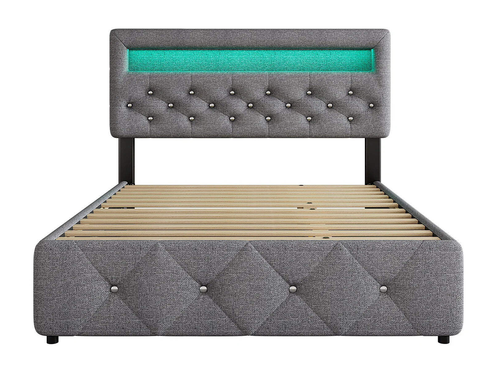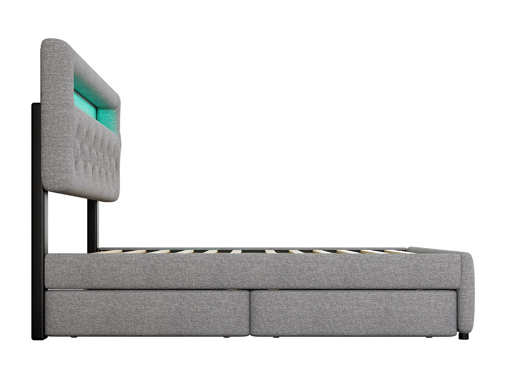 Gestoffeerd uitschuifbed 140x200cm+90x200cm, tweepersoonsbed met 2 lades, nachtkastje met lichtbalk, grijs