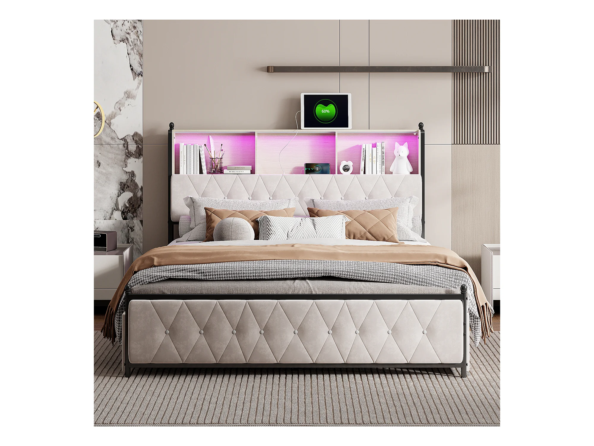 Tweepersoonsbed 160x200 cm met LED-verlichting en USB-voet, 3 lades, hoofdbord met opbergruimte, fluweel, beige