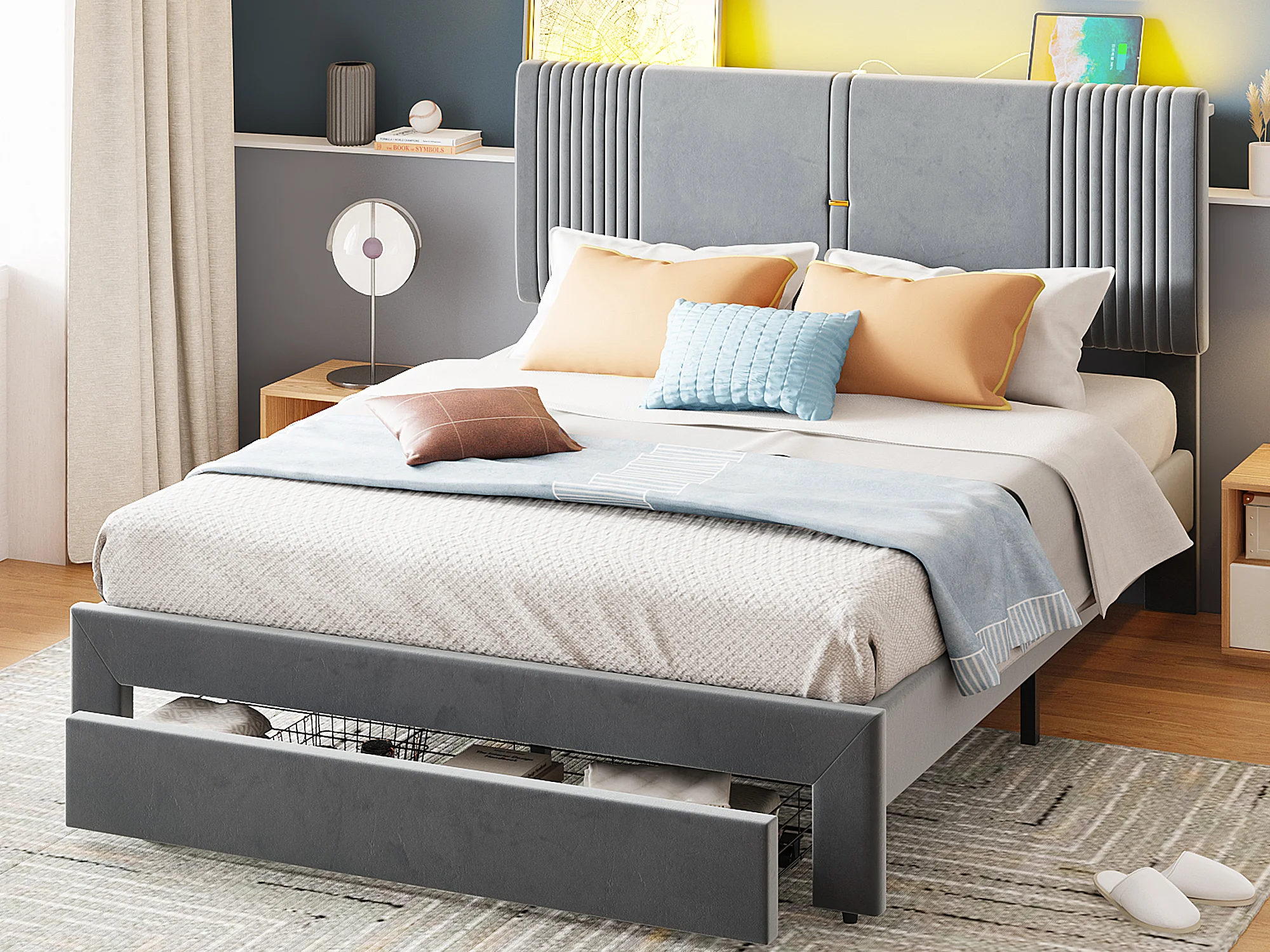 Gestoffeerd volwassenenbed 140 x 200 cm met grote lade - LED's + USB - Fluweel - Grijs