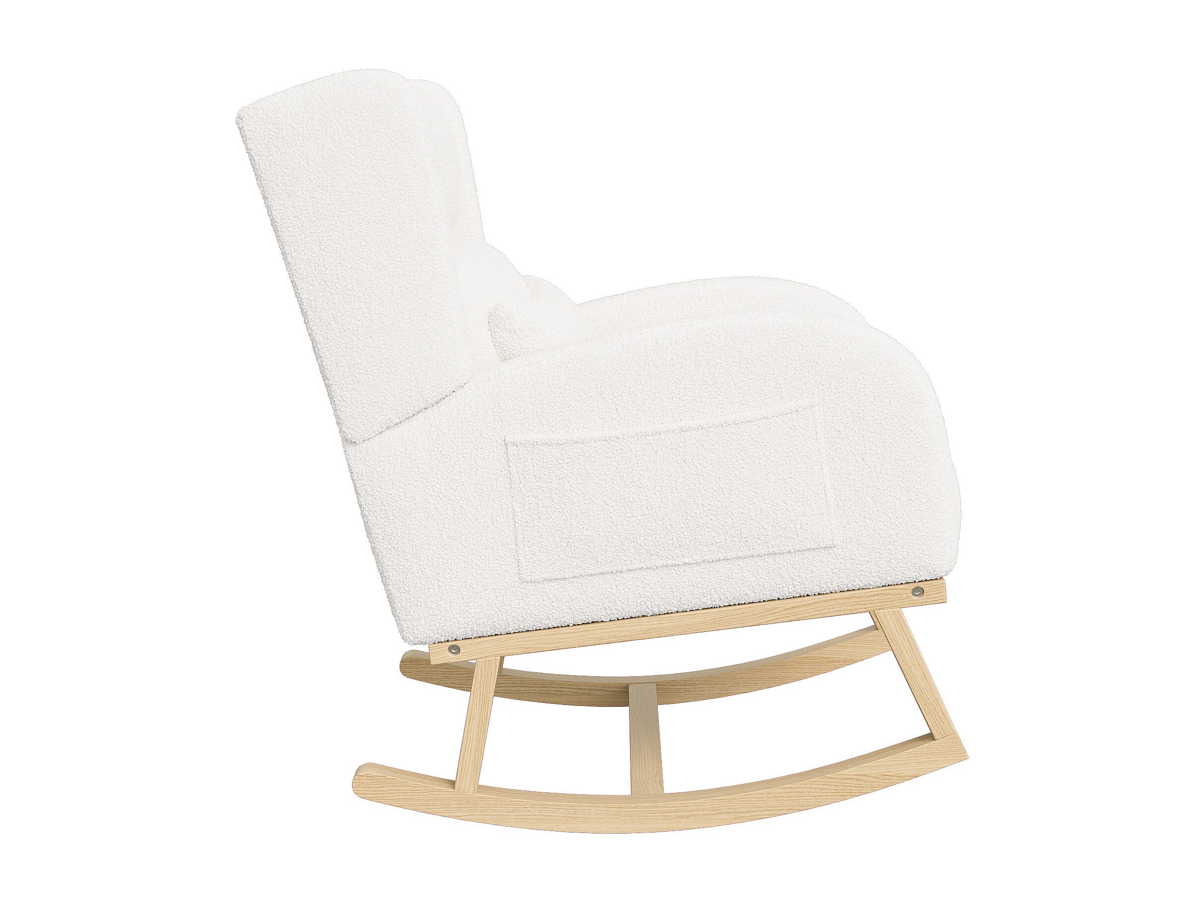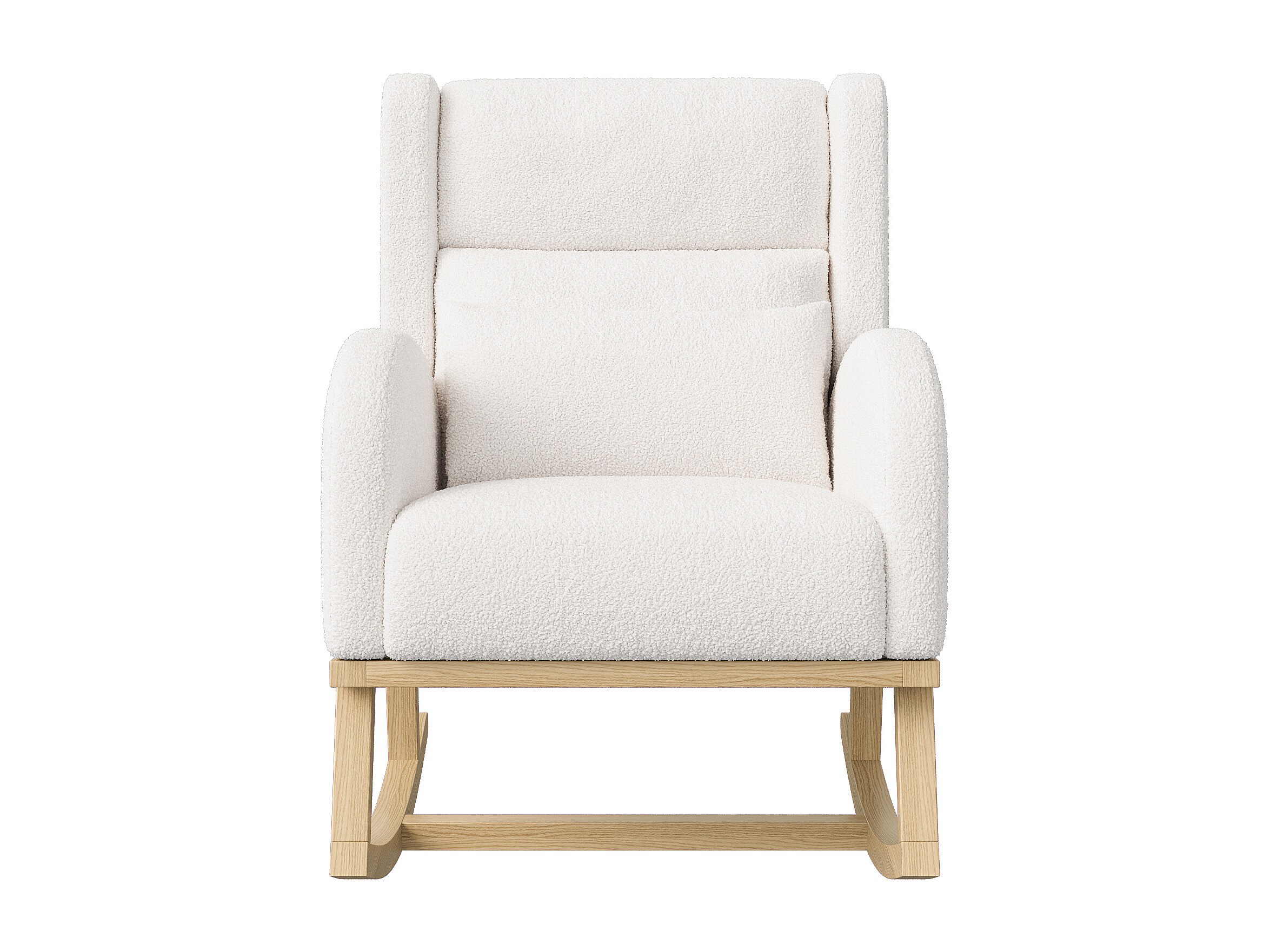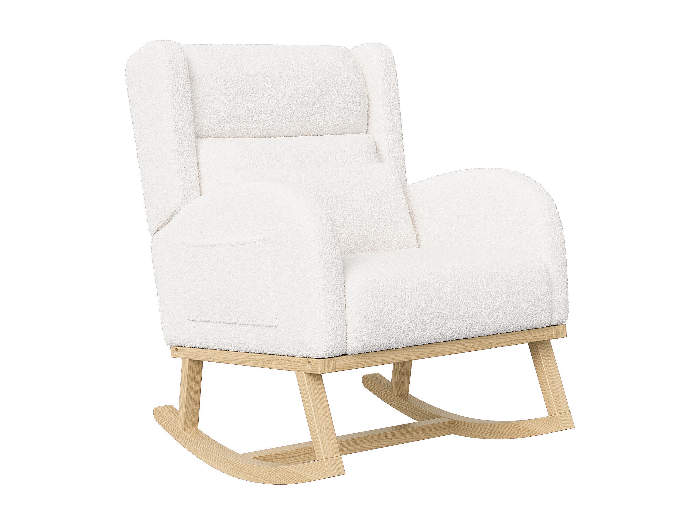 Gestoffeerde Bouclé stoffen schommelstoel met lendensteun en houten poten, wit