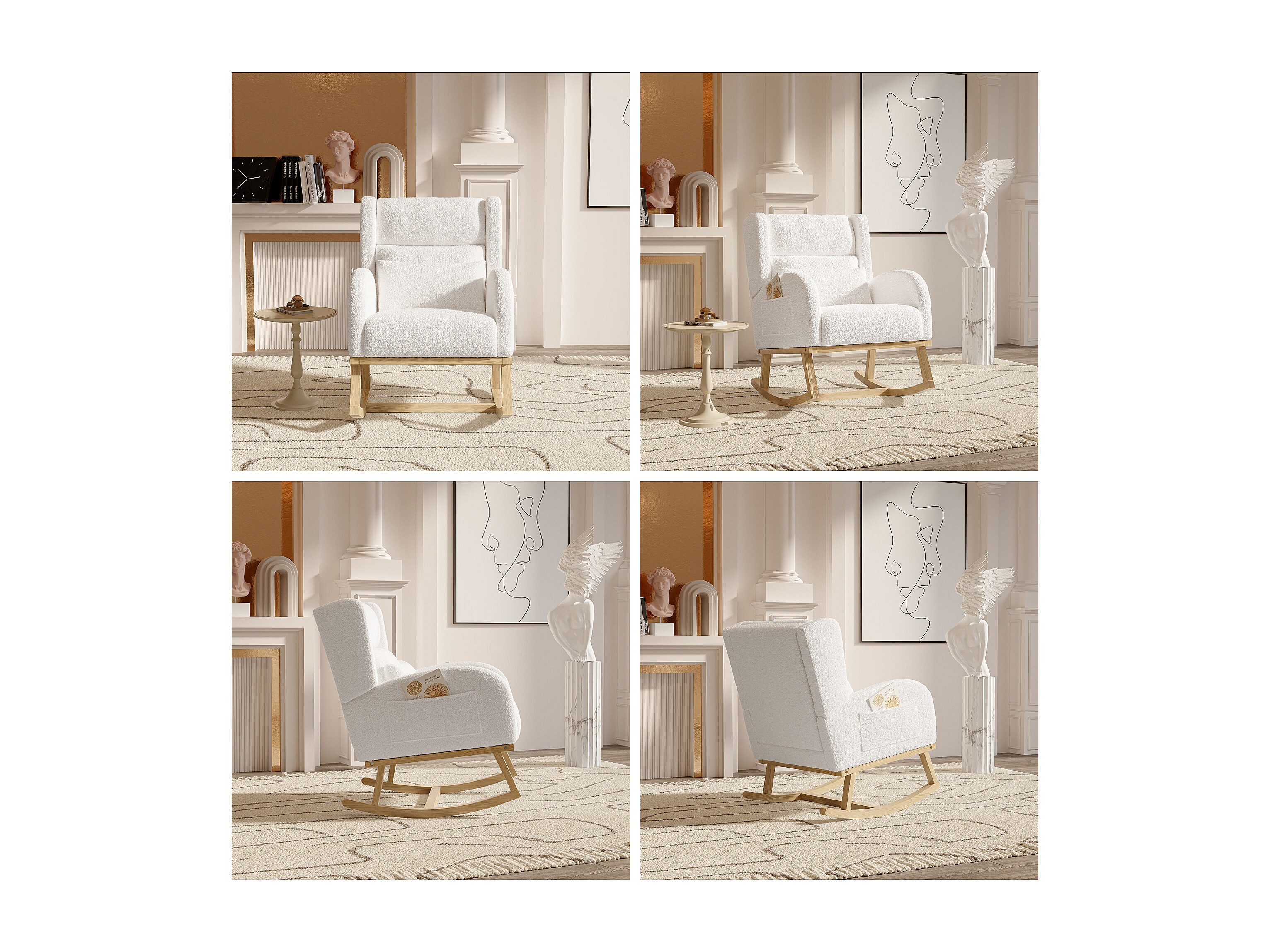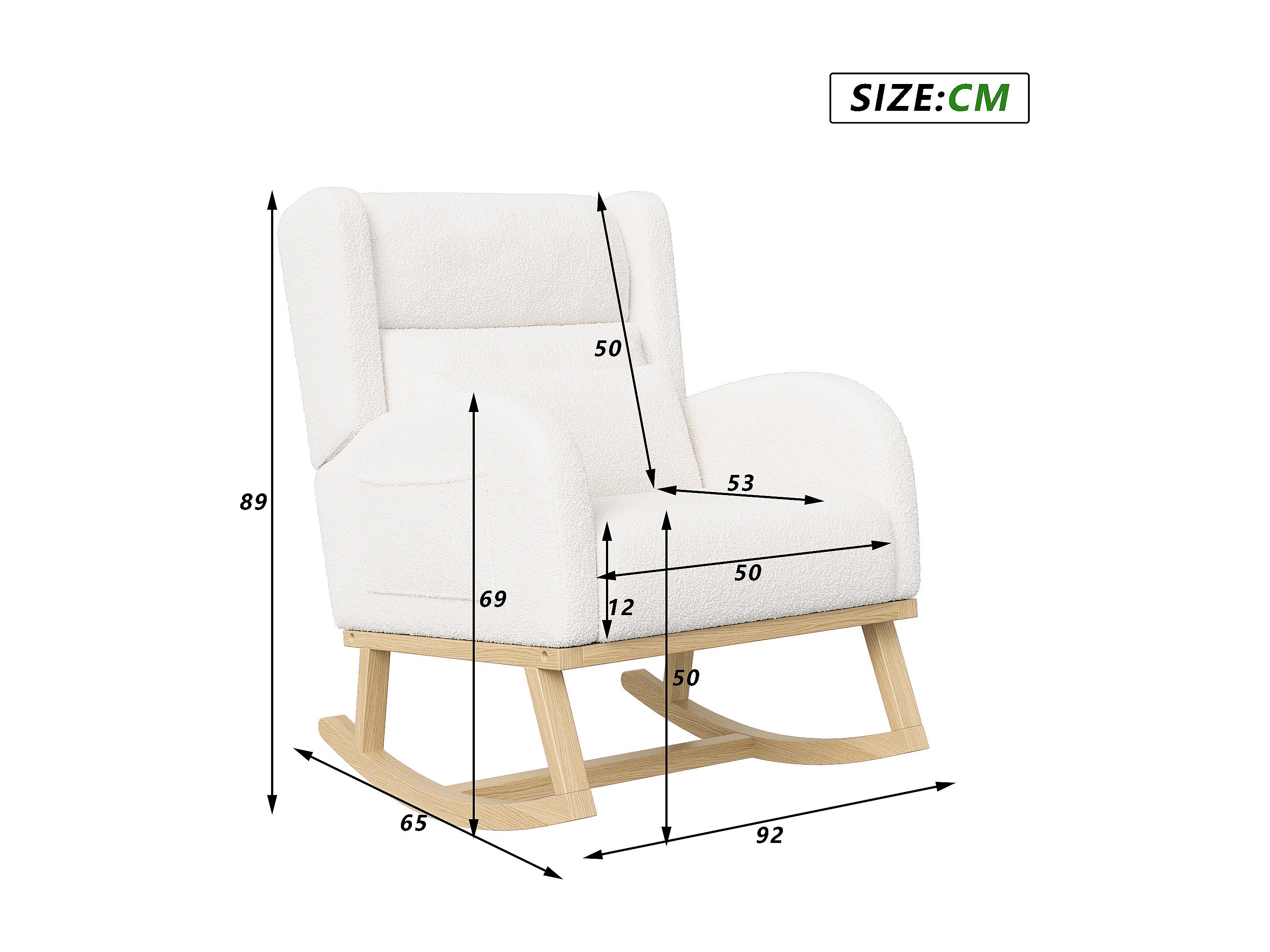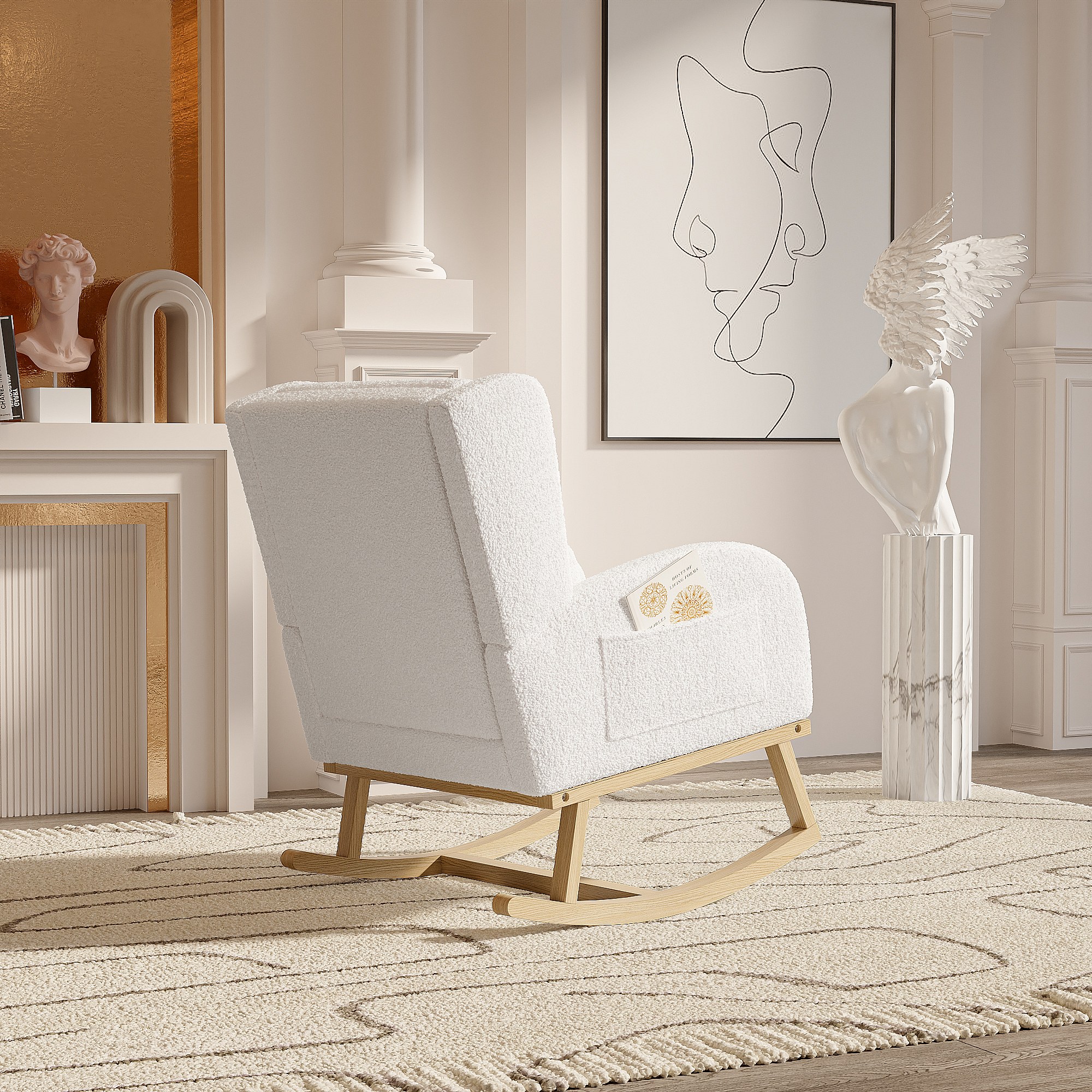 Gestoffeerde Bouclé stoffen schommelstoel met lendensteun en houten poten, wit