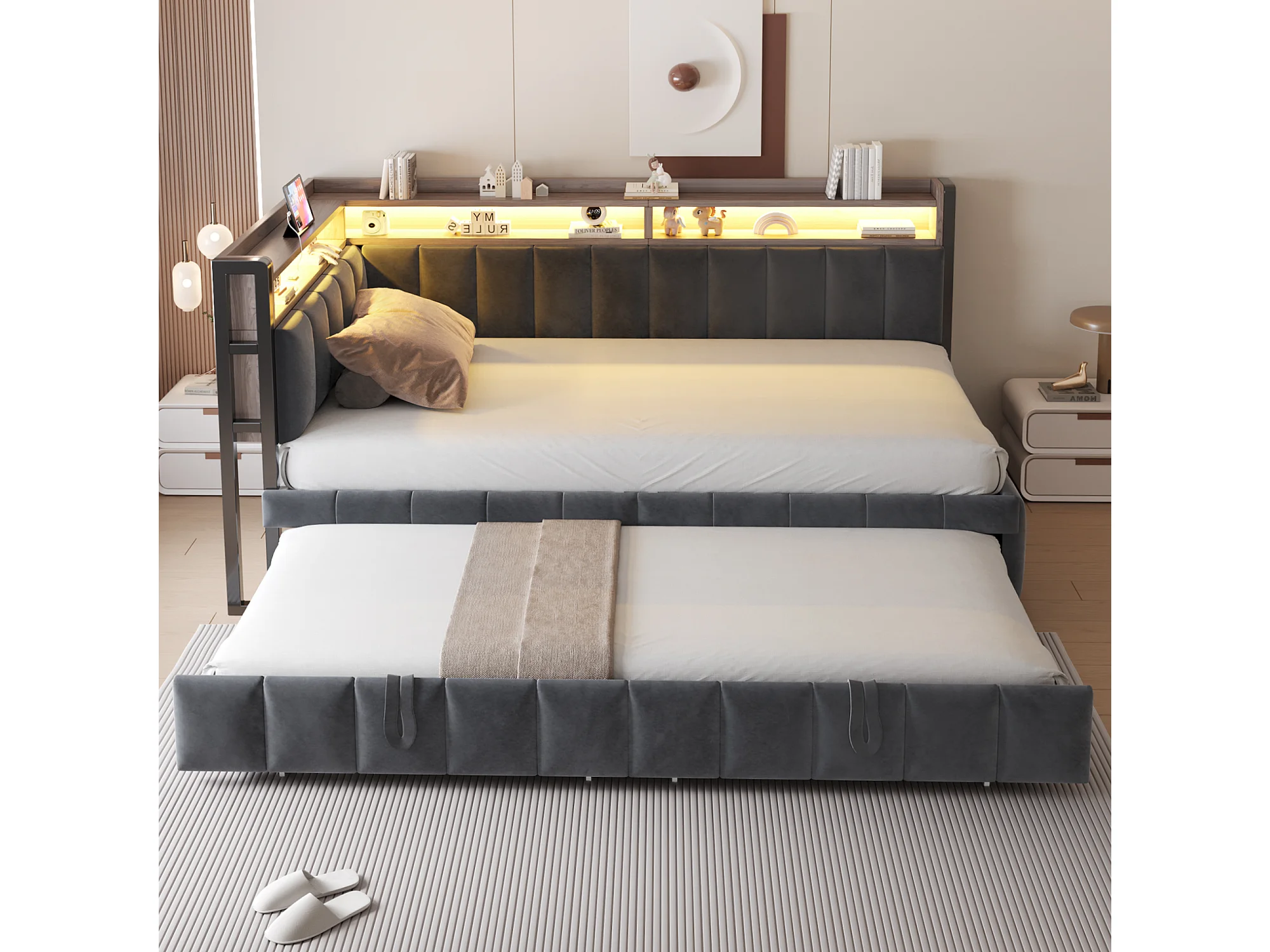 Gestoffeerde slaapbank - 90 x 200 cm - met uitschuifbed 90 x 200 cm + LED's + plank + USB en Type-C - fluweel - grijs