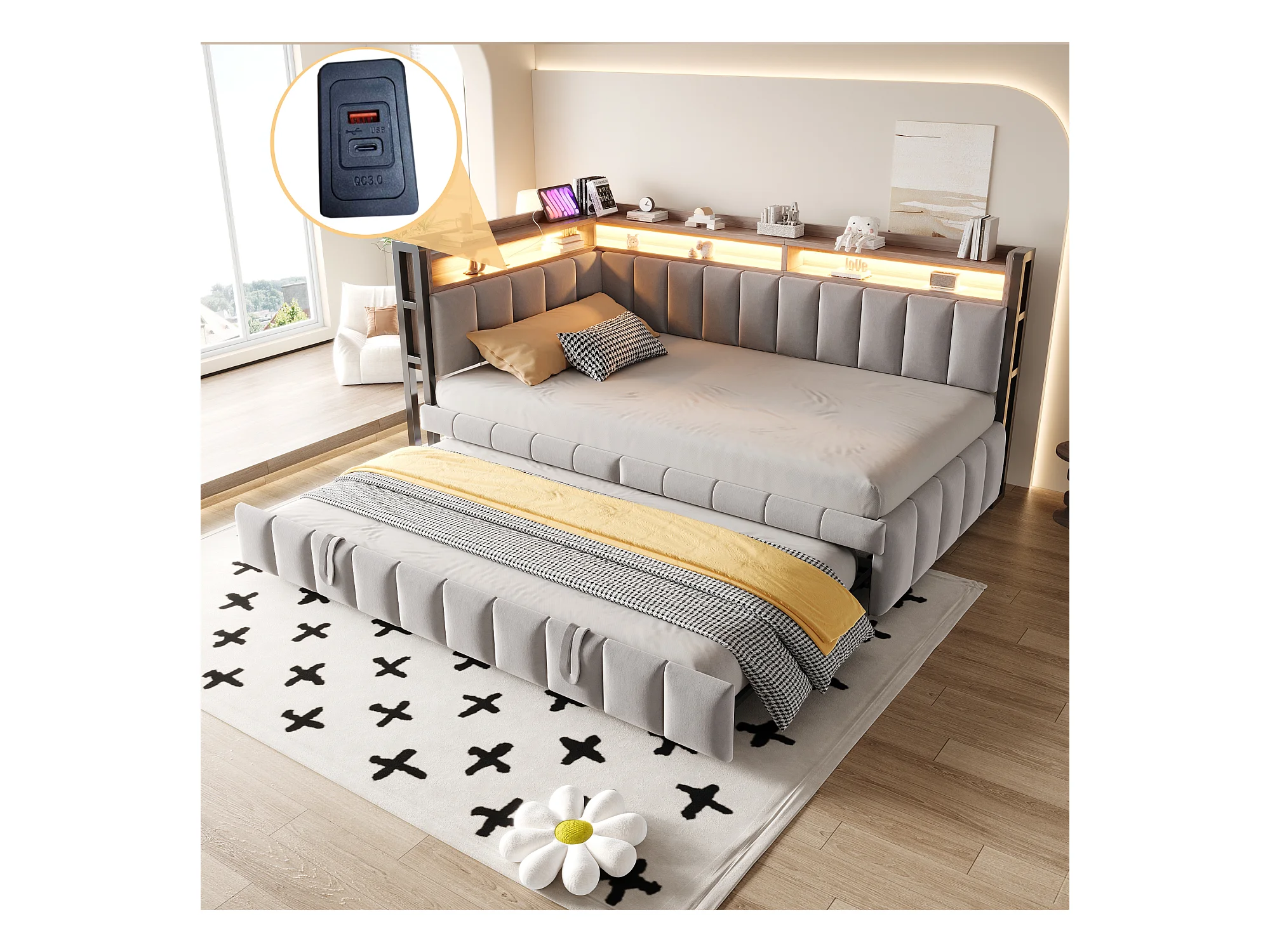 Daybed 90x200 cm met uitschuifbed en opbergplank, USB-aansluiting - grijs - zonder matras
