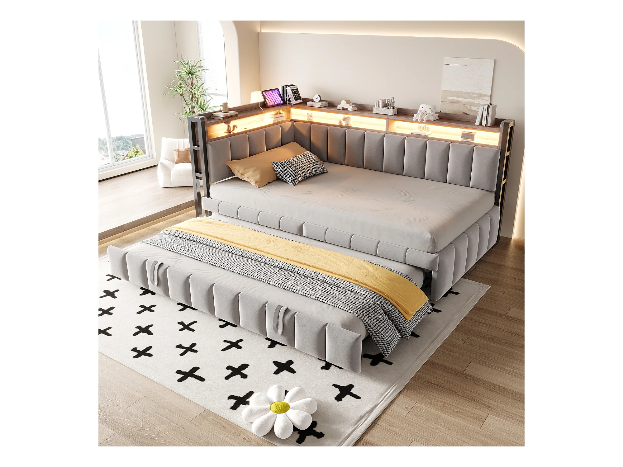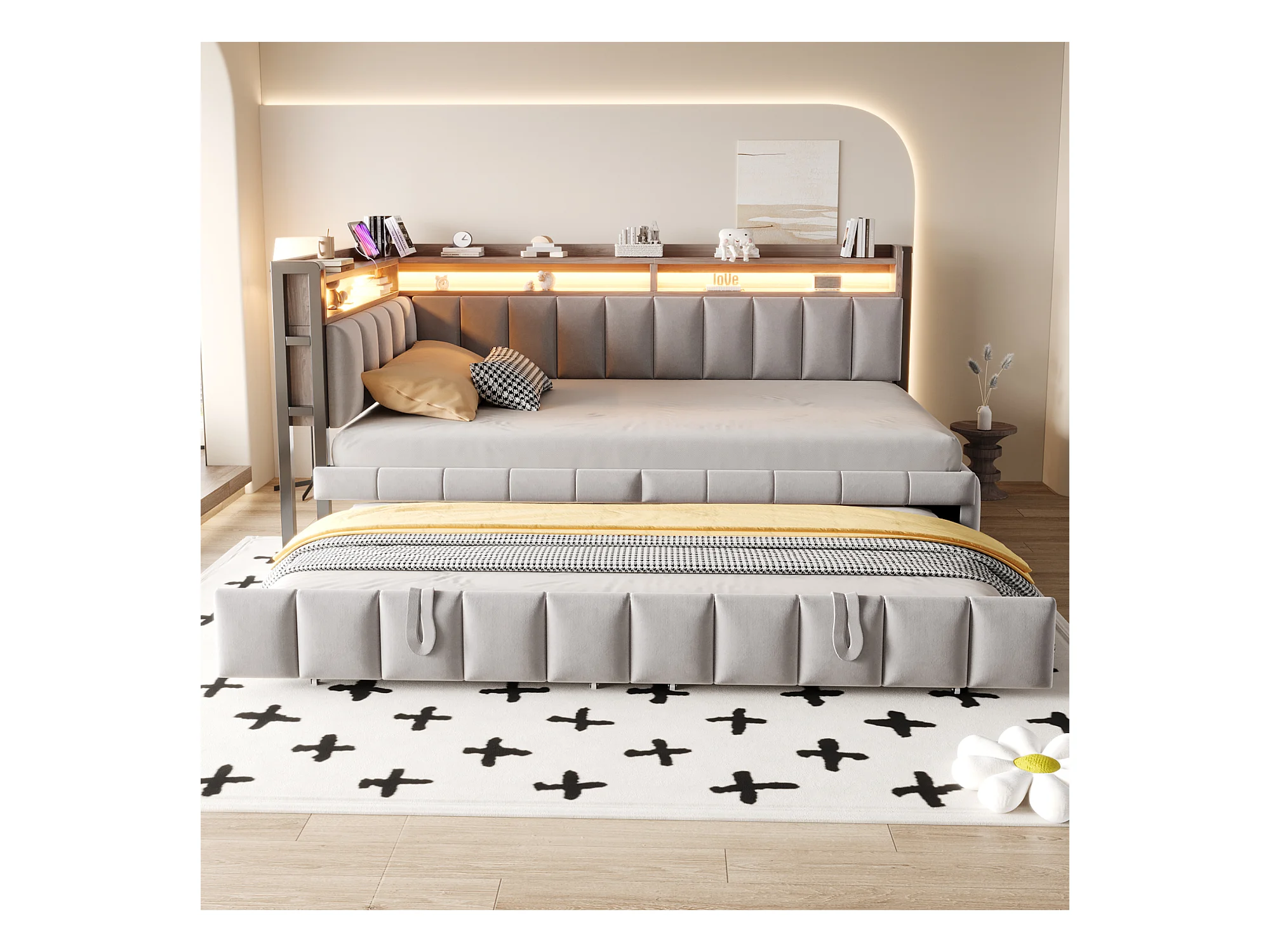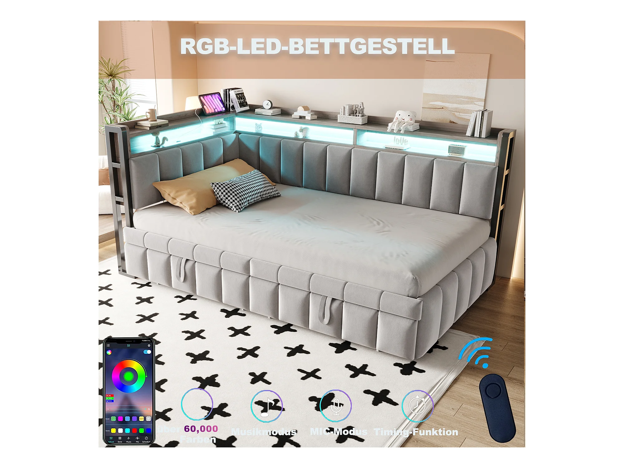 Gestoffeerde slaapbank - 90 x 200 cm - met uitschuifbed 90 x 200 cm + LED's + plank + USB en Type-C - fluweel - lichtgrijs