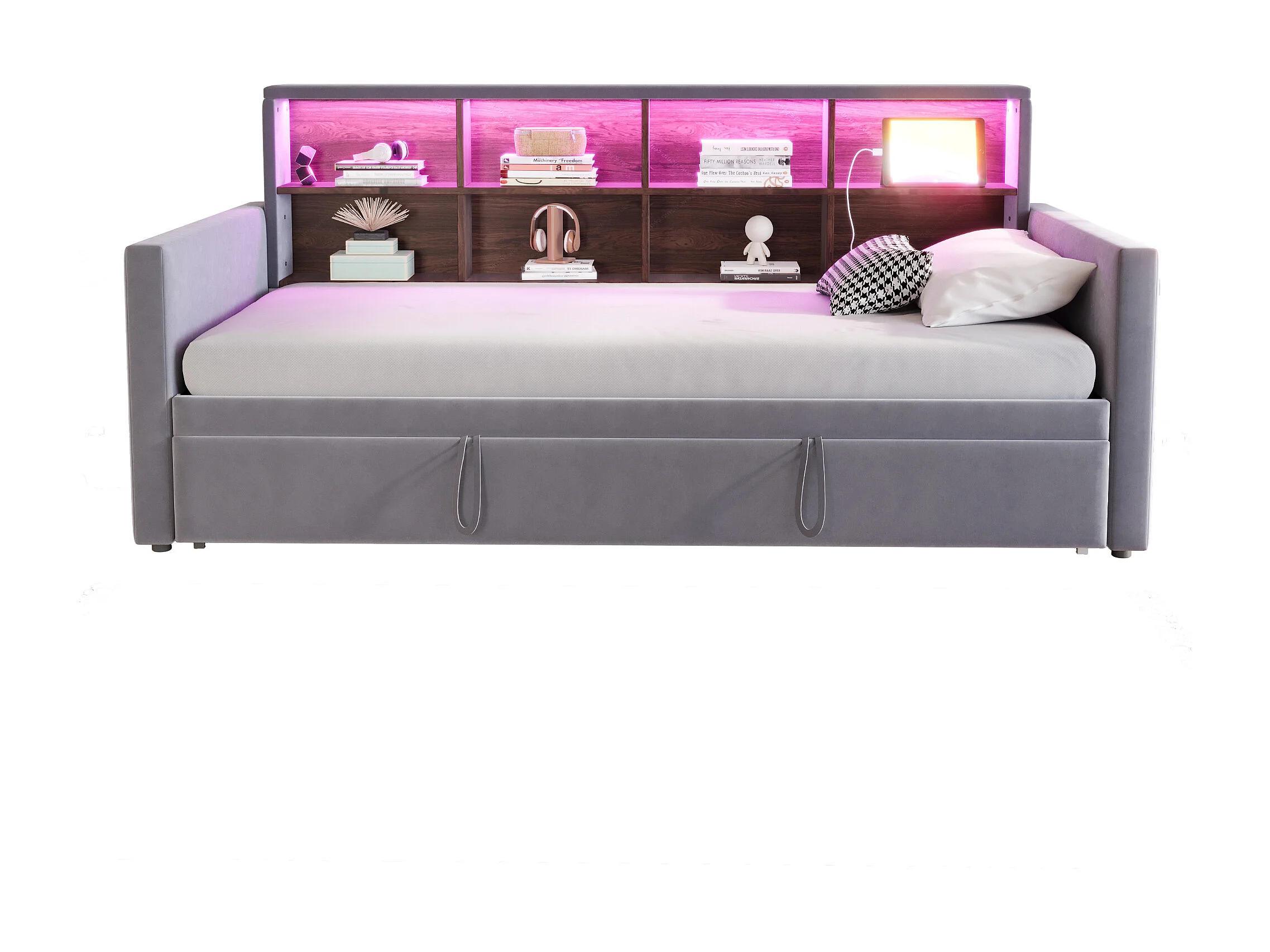 Gestoffeerde slaapbank 90x190cm - met LED-verlichting - met oplaadaansluiting - met uitschuifbaar bed - fluweel stof - Donkergrijs