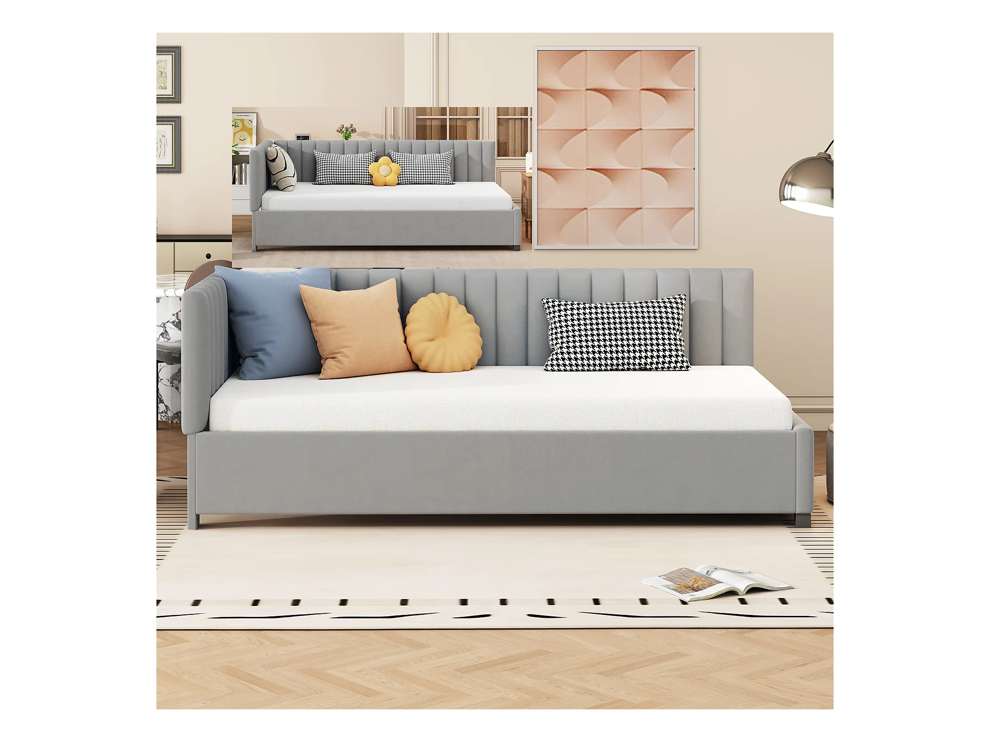 Gestoffeerde slaapbank 90x200 cm multifunctioneel met lattenbodem, grijs fluweel, huidvriendelijke stof