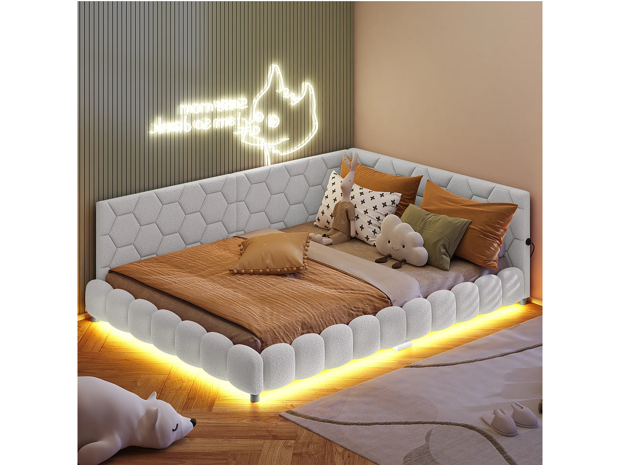Volwassen bed 140x200 cm - Tweepersoonsbed met LED-verlichting en USB-oplader - lattenbodem - roze pluche