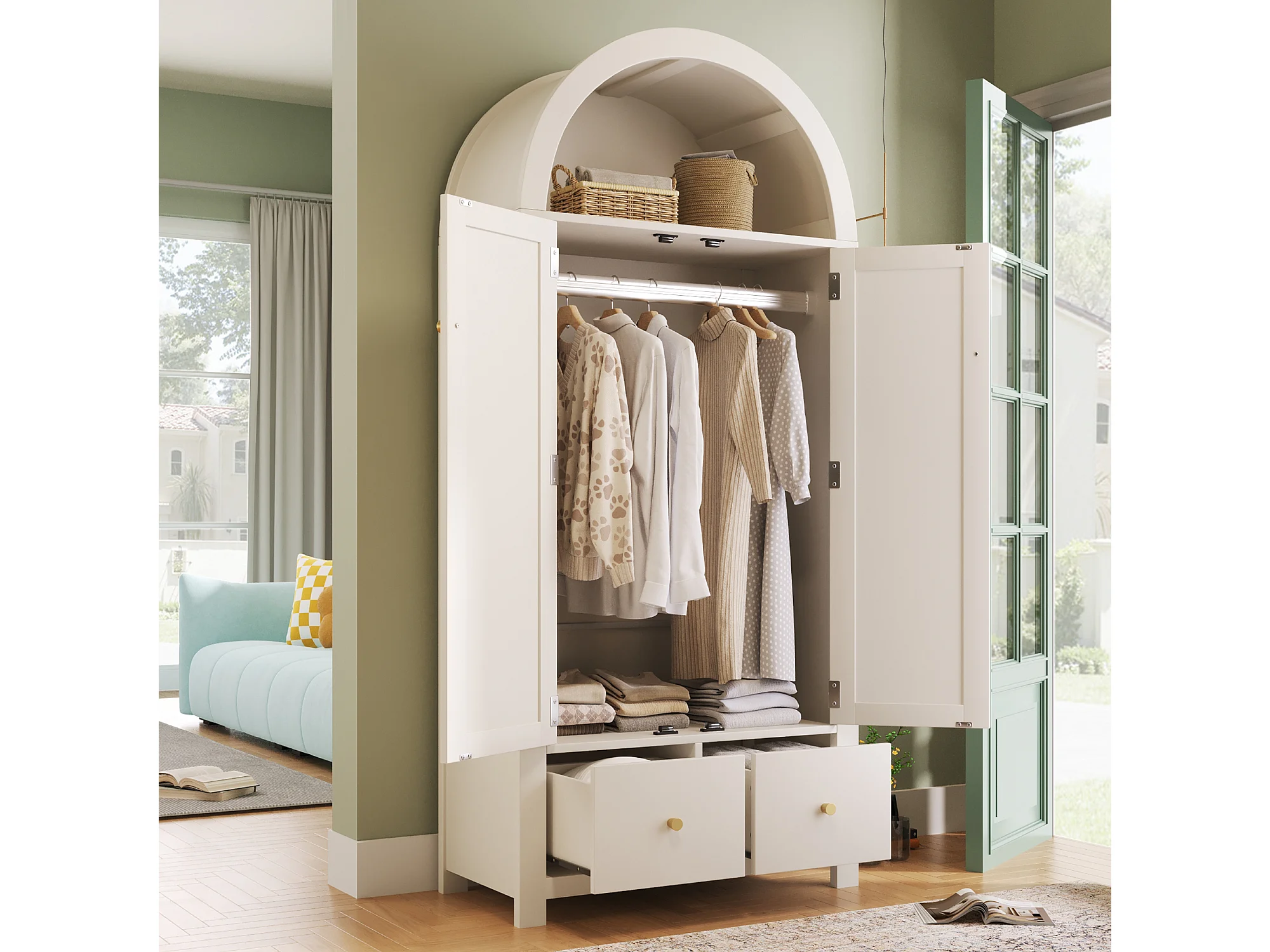 Gevlochten rotan kledingkast - 181 x 78 x 45 cm - landelijke stijl met eikenhouten afwerking - met plank + 2 deuren + 2 lades - hout - wit