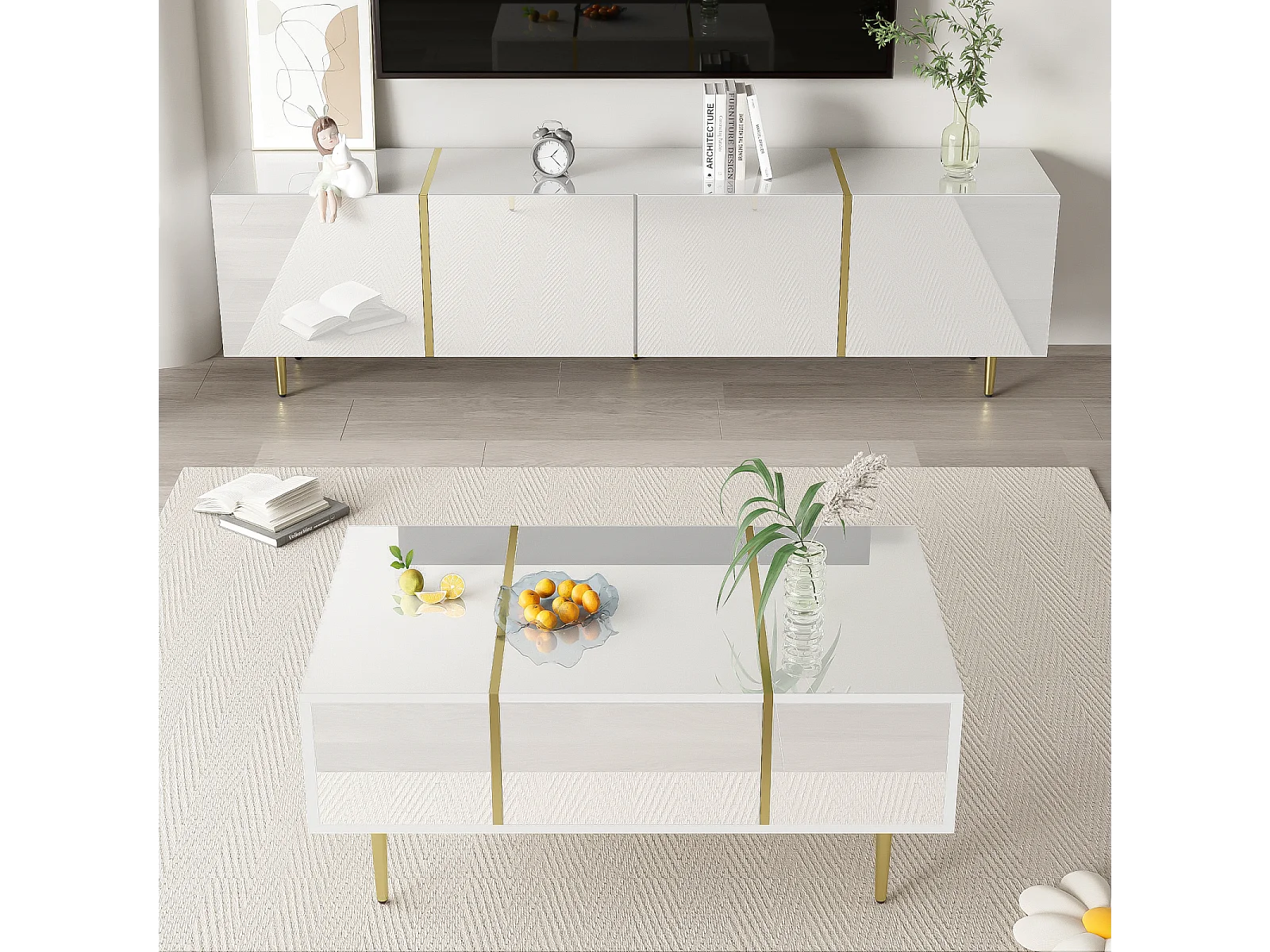 Glanzende tv-standaard en moderne salontafelset, opbergkasten, wit